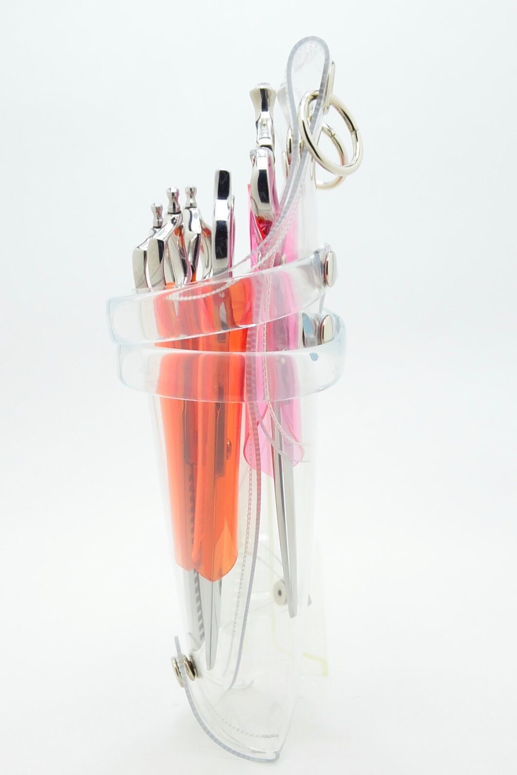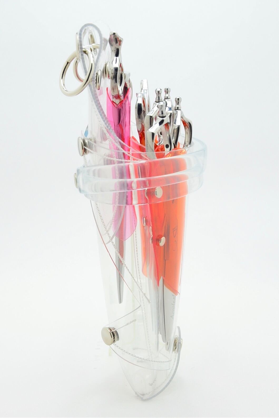 このシザーケースは、あなたのシザーを入れる事によって完成します。透明なシザーケースから仕事道具であるシザーが魅える事が最大のデザインの魅力となっています。
