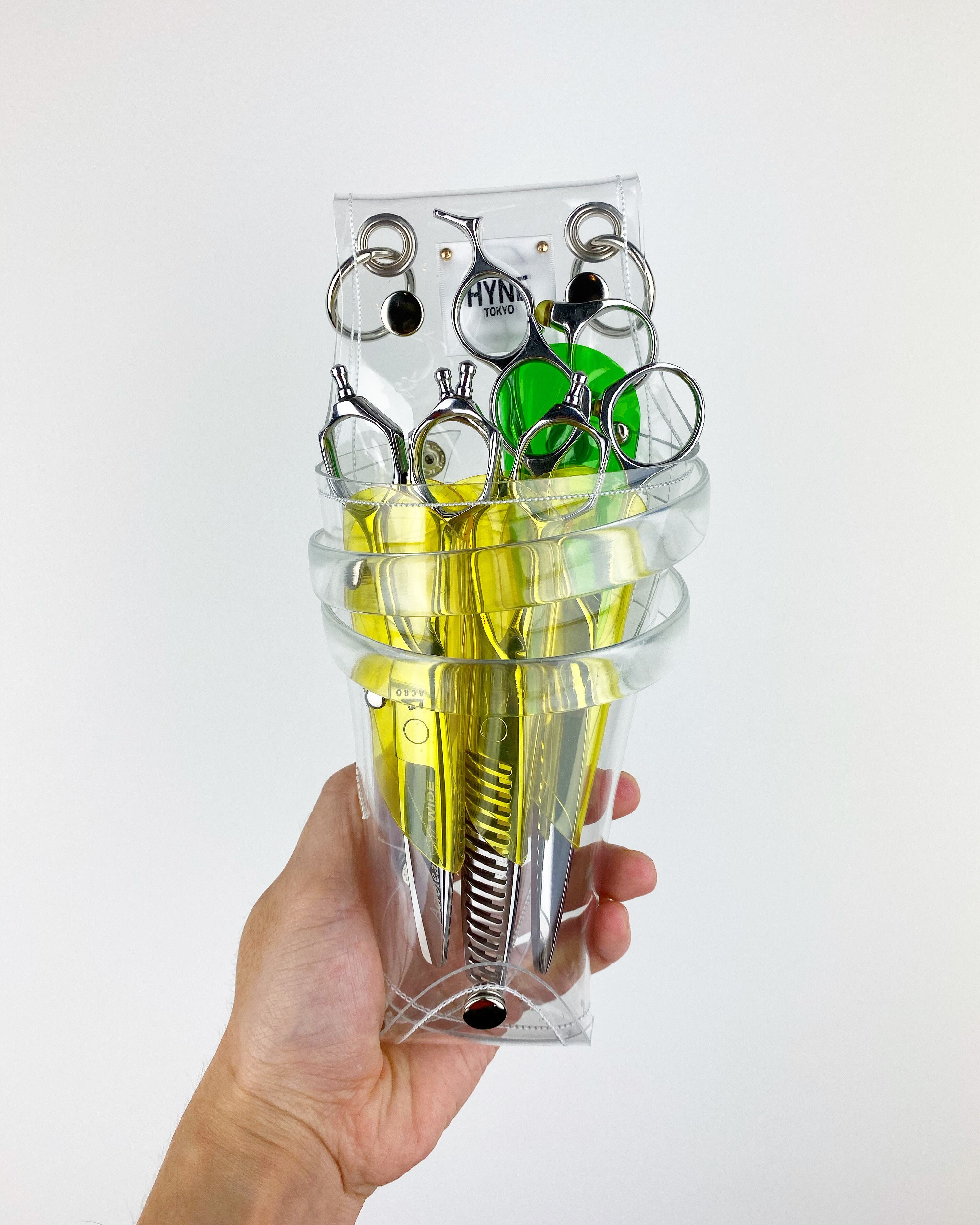 このシザーケースは、あなたのシザーを入れる事によって完成します。透明なシザーケースから仕事道具であるシザーが魅える事が最大のデザインの魅力となっています。