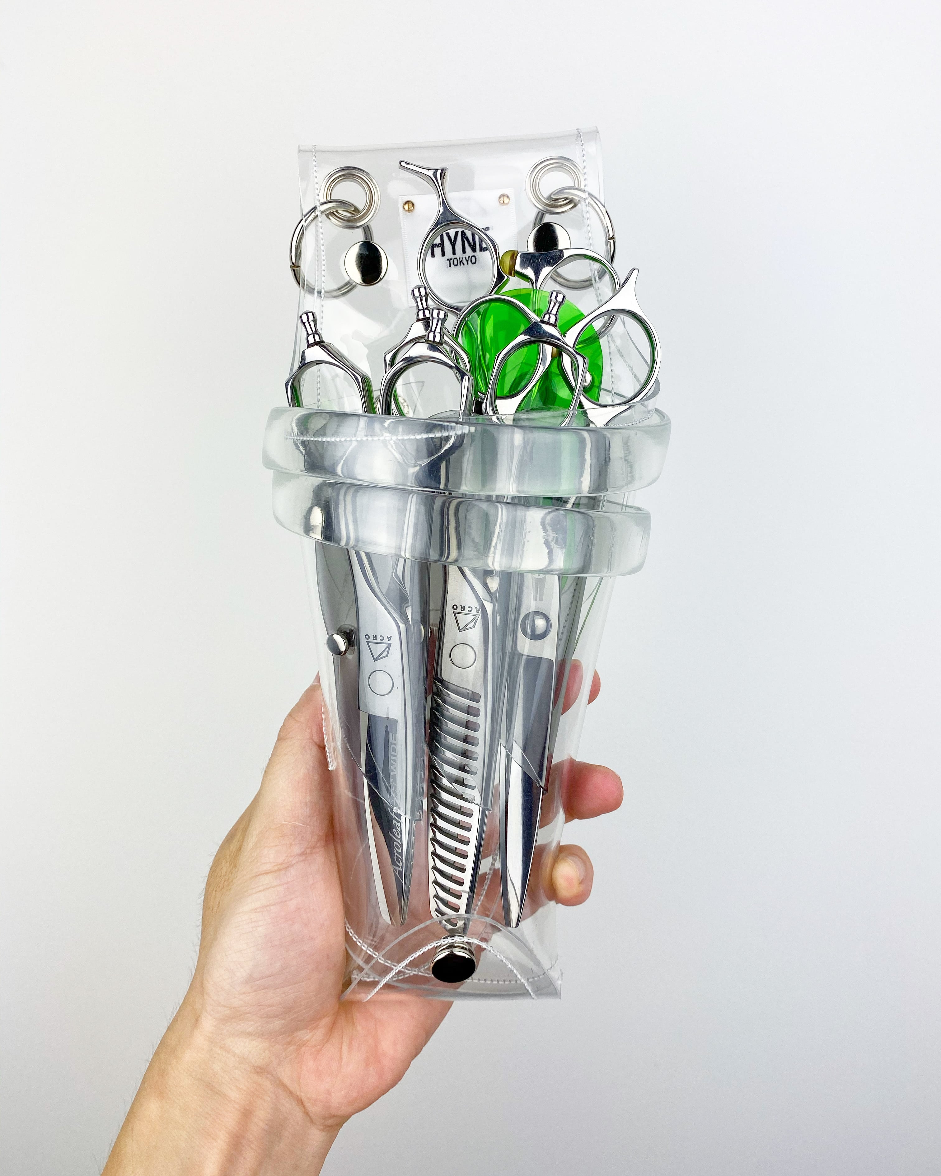 このシザーケースは、あなたのシザーを入れる事によって完成します。透明なシザーケースから仕事道具であるシザーが魅える事が最大のデザインの魅力となっています。