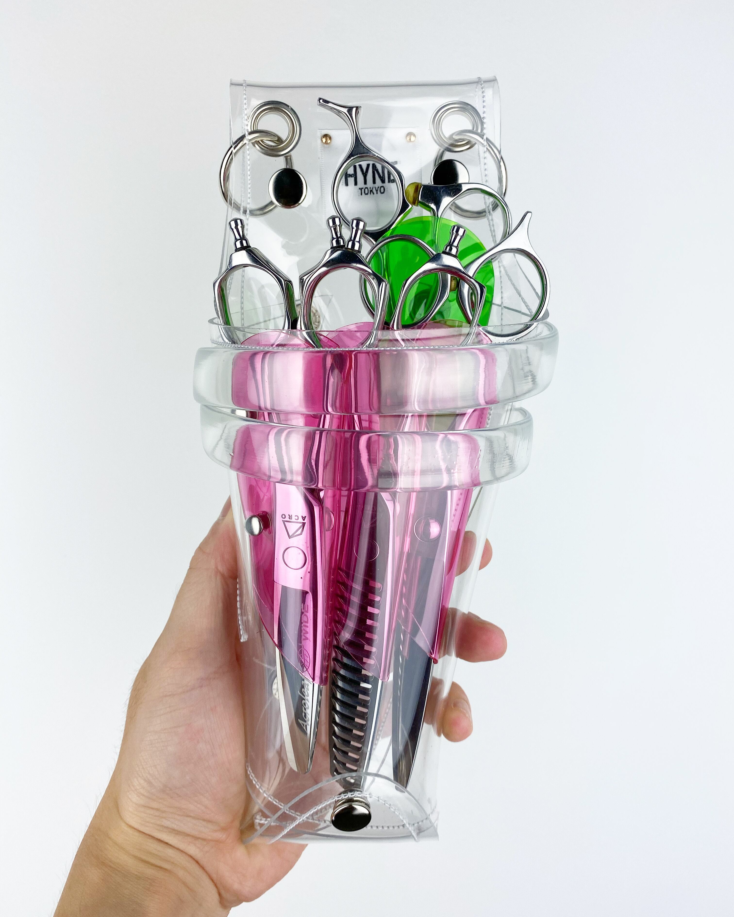 このシザーケースは、あなたのシザーを入れる事によって完成します。透明なシザーケースから仕事道具であるシザーが魅える事が最大のデザインの魅力となっています。