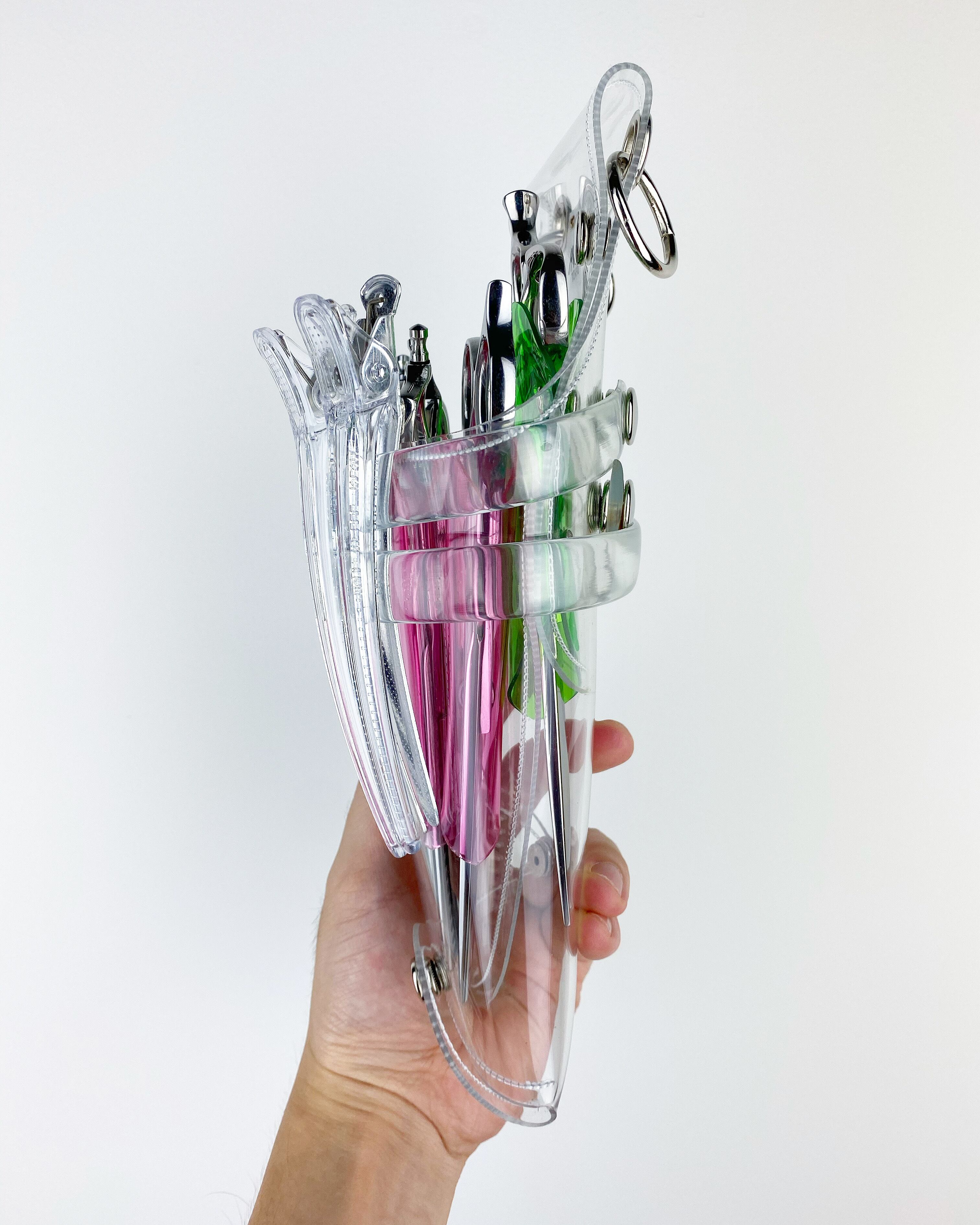 PVCの特性であるクリア(透明)である事で、美容師の仕事道具であるシザーのこれまでなかった魅せ方を提案しています。