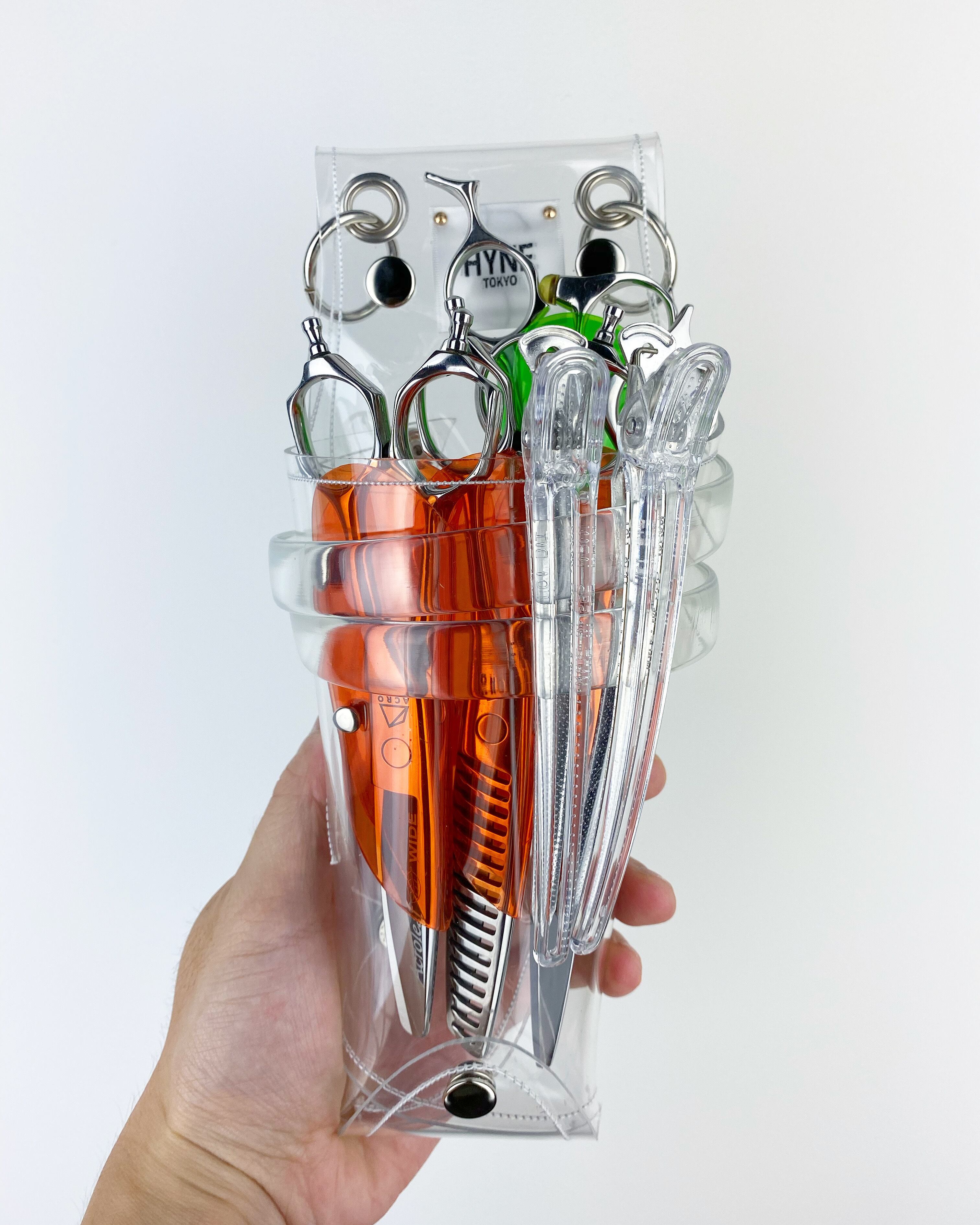 このシザーケースは、あなたのシザーを入れる事によって完成します。透明なシザーケースから仕事道具であるシザーが魅える事が最大のデザインの魅力となっています。