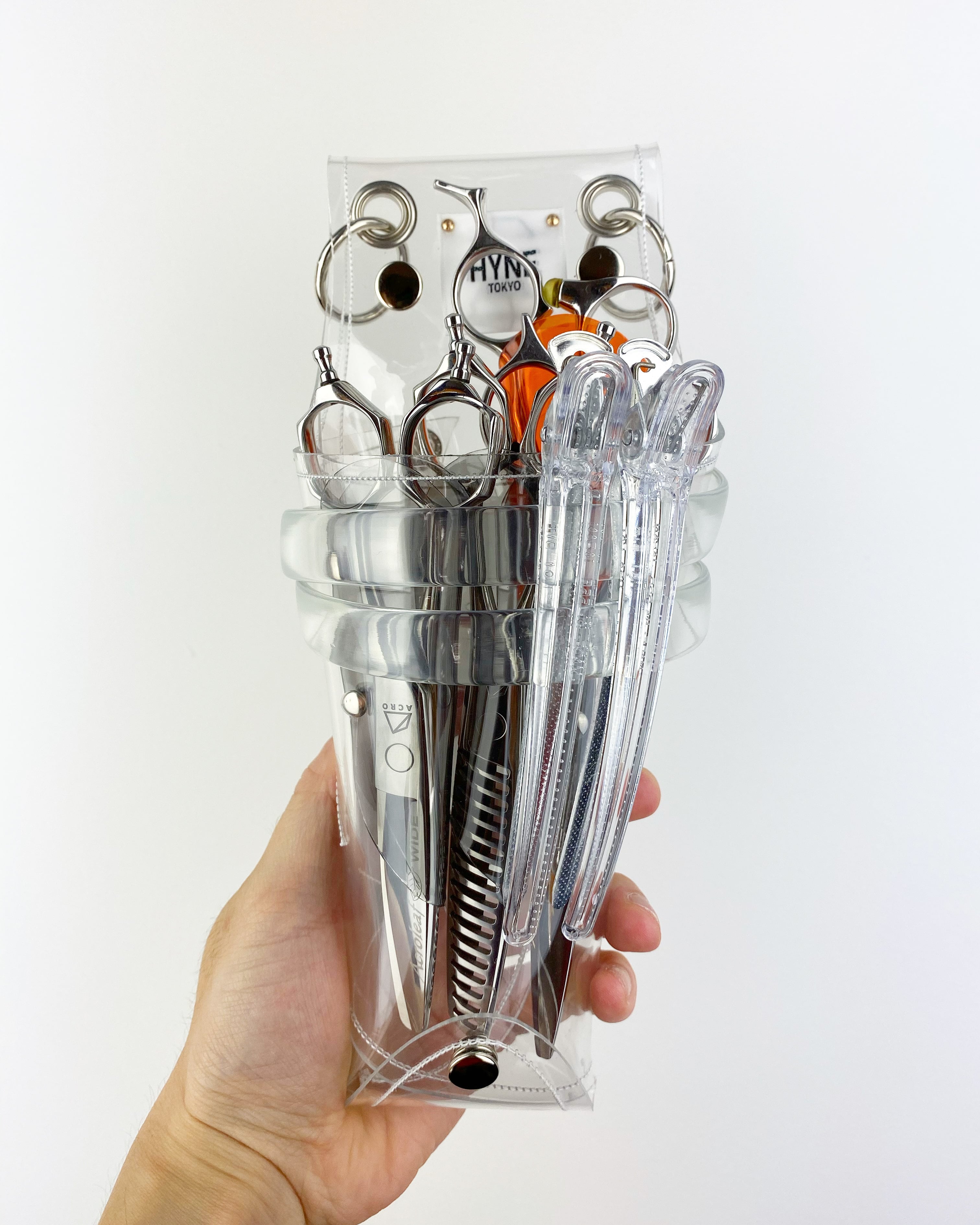 このシザーケースは、あなたのシザーを入れる事によって完成します。透明なシザーケースから仕事道具であるシザーが魅える事が最大のデザインの魅力となっています。