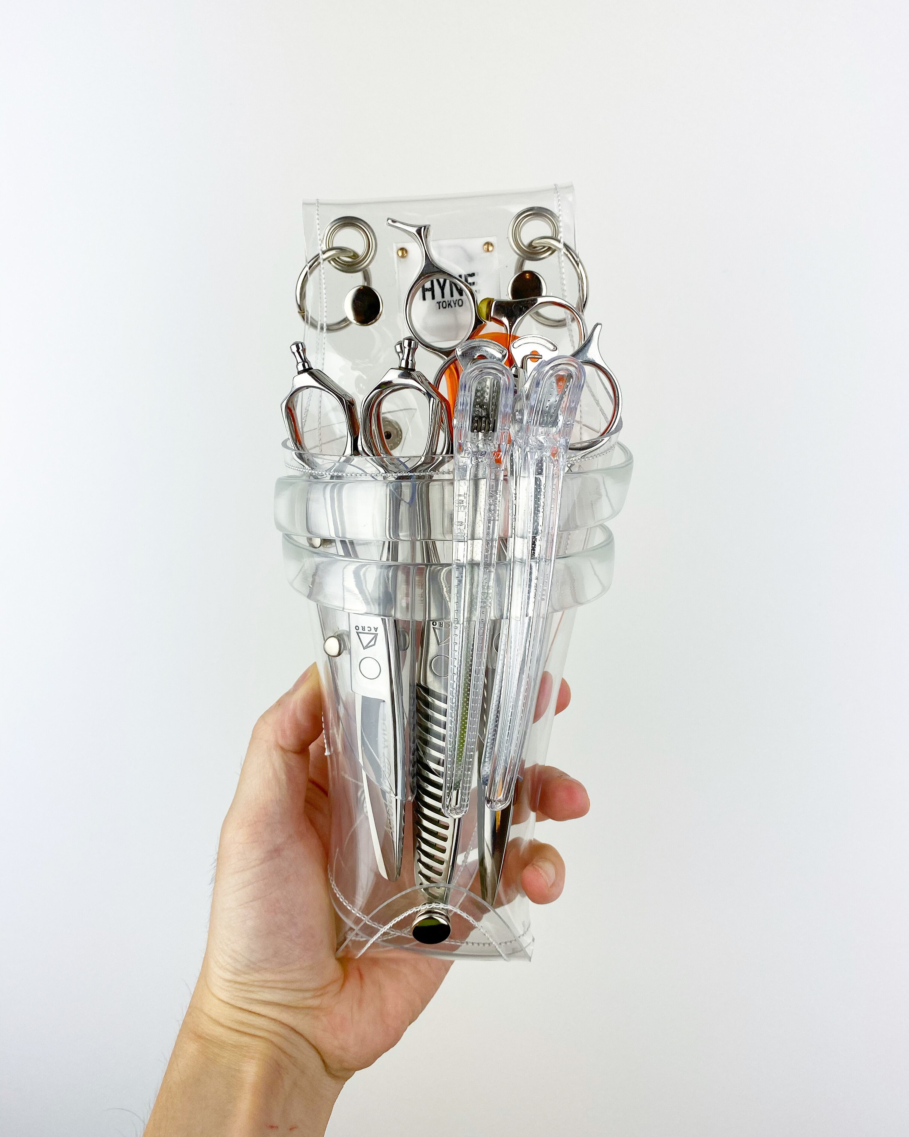 このシザーケースは、あなたのシザーを入れる事によって完成します。透明なシザーケースから仕事道具であるシザーが魅える事が最大のデザインの魅力となっています。