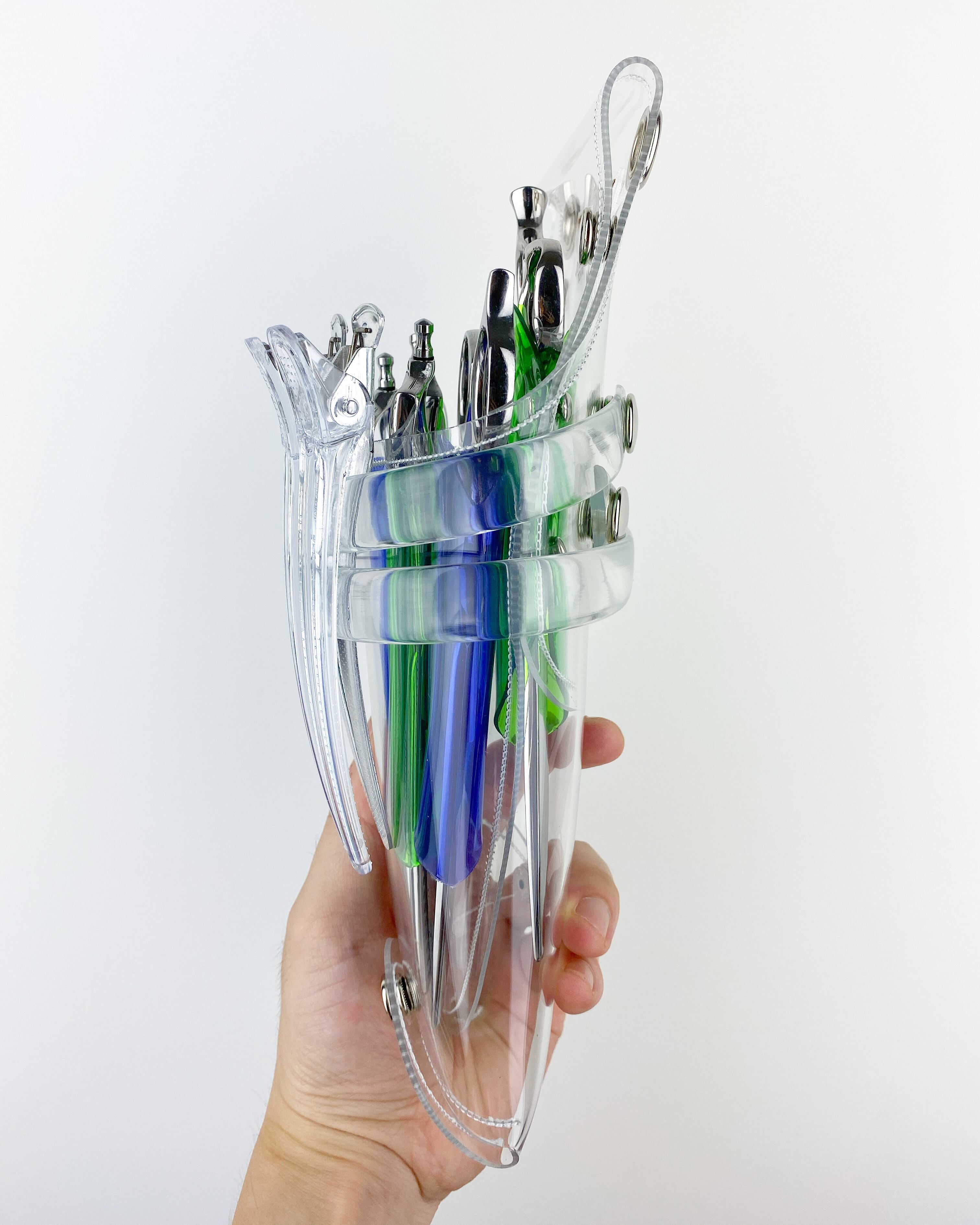 PVCの特性であるクリア(透明)である事で、美容師の仕事道具であるシザーのこれまでなかった魅せ方を提案しています。