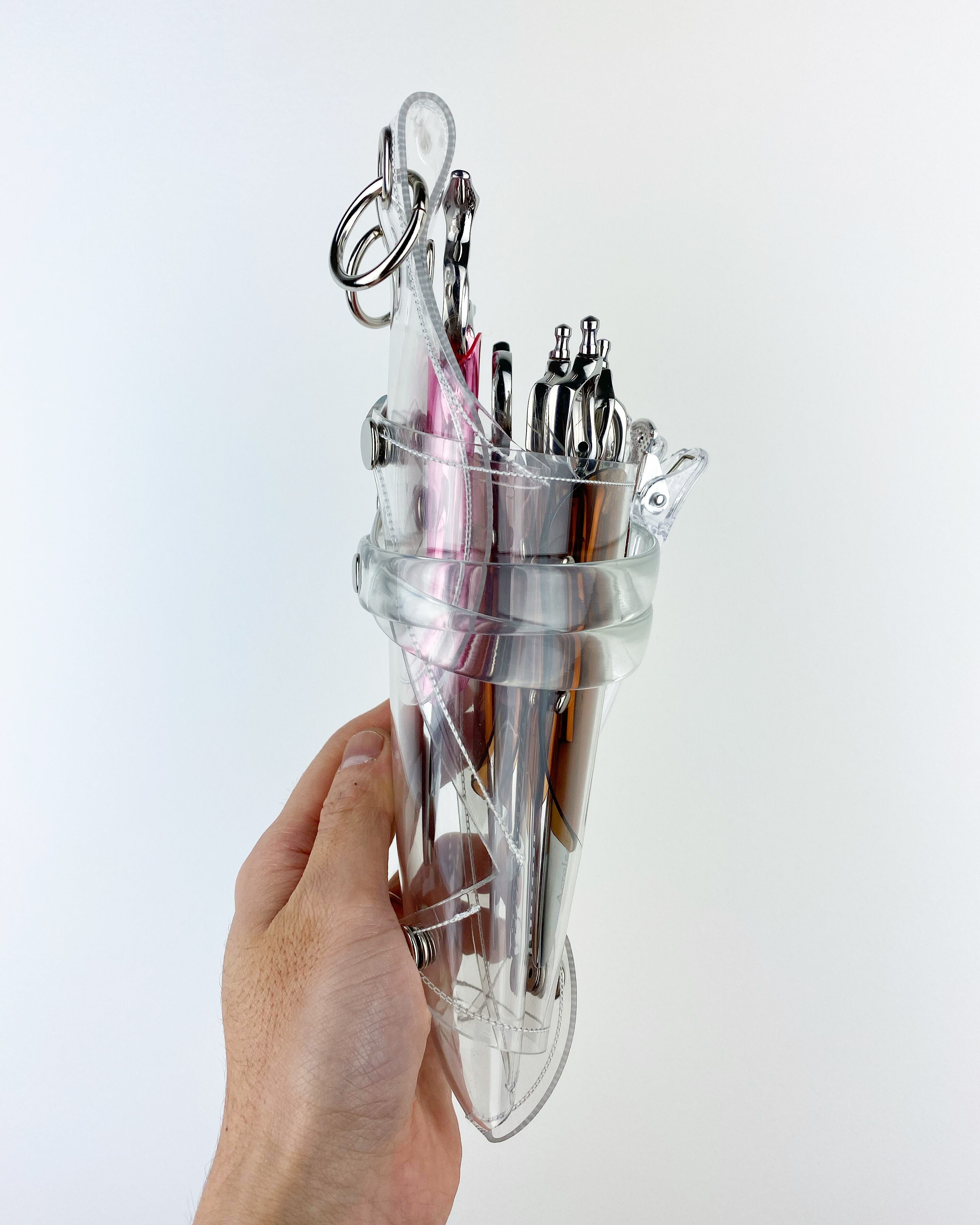 このシザーケースは、あなたのシザーを入れる事によって完成します。透明なシザーケースから仕事道具であるシザーが魅える事が最大のデザインの魅力となっています。