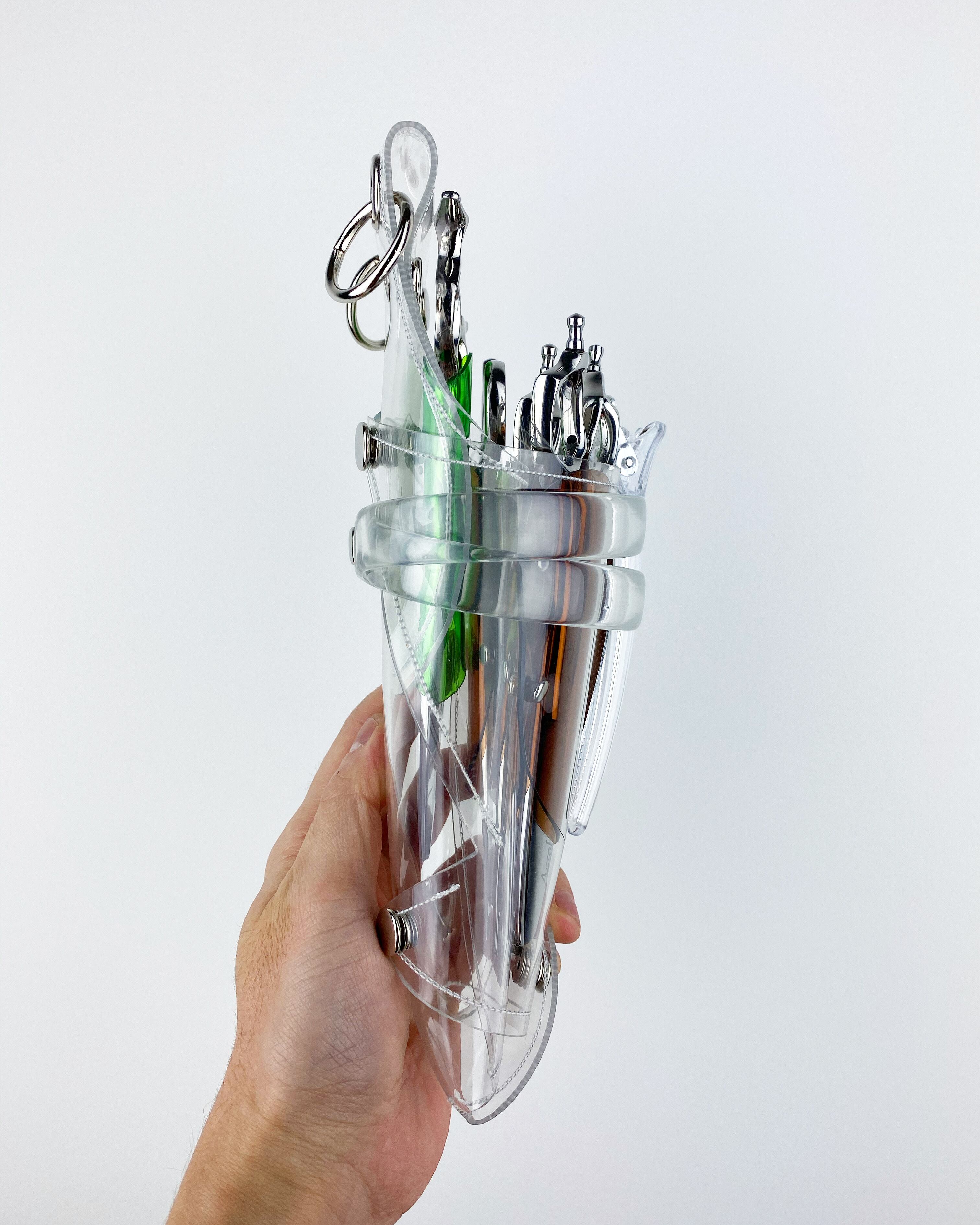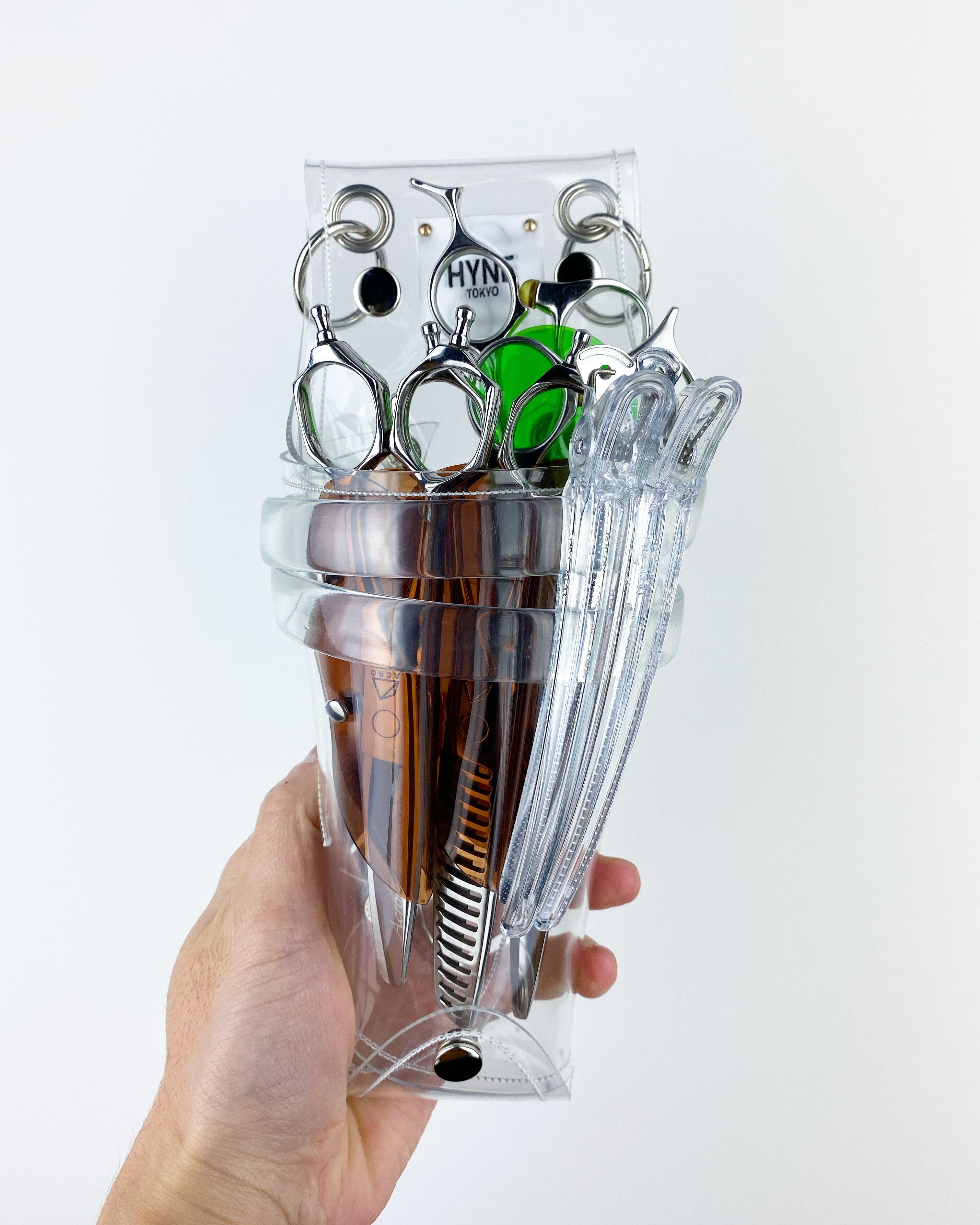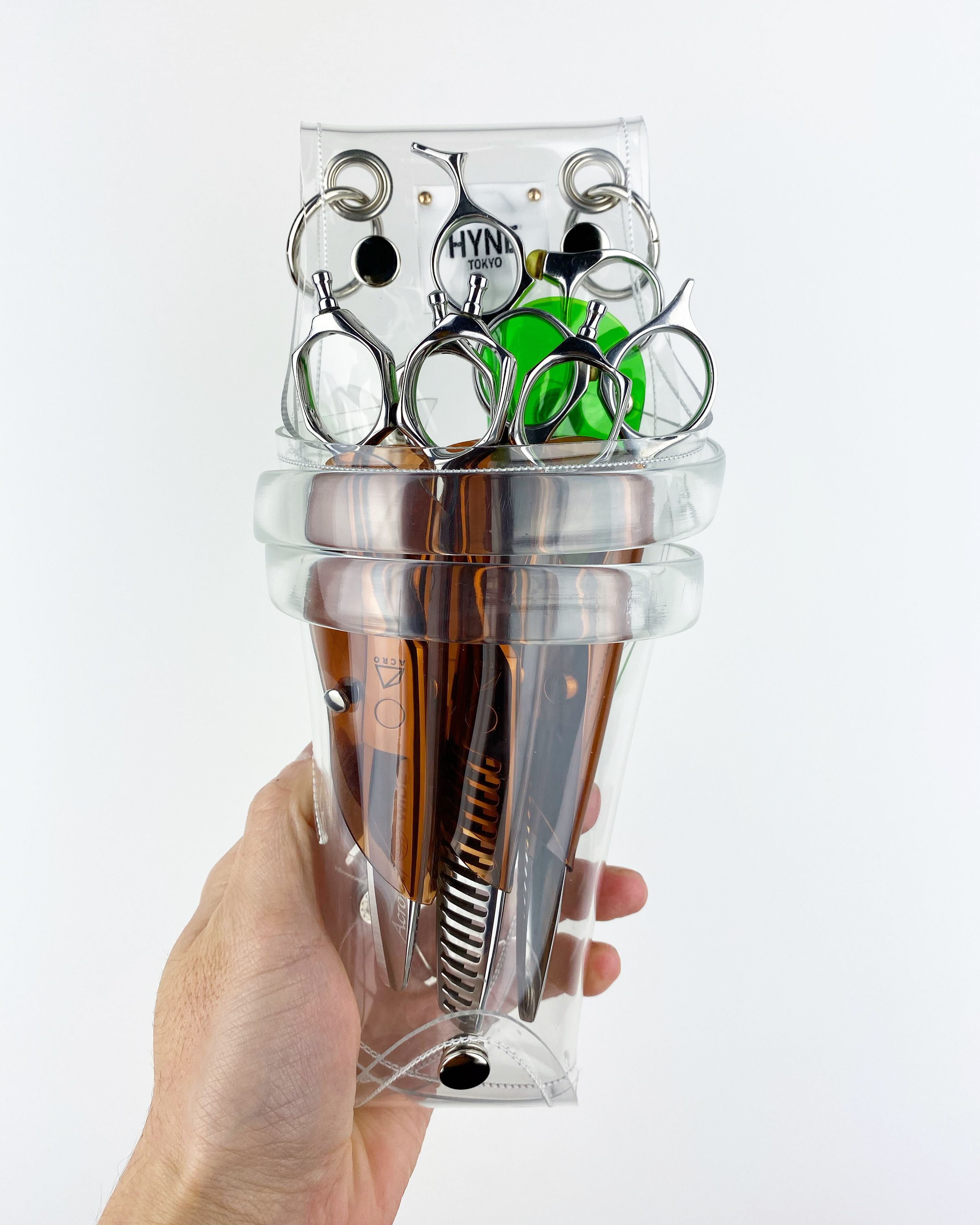 このシザーケースは、あなたのシザーを入れる事によって完成します。透明なシザーケースから仕事道具であるシザーが魅える事が最大のデザインの魅力となっています。