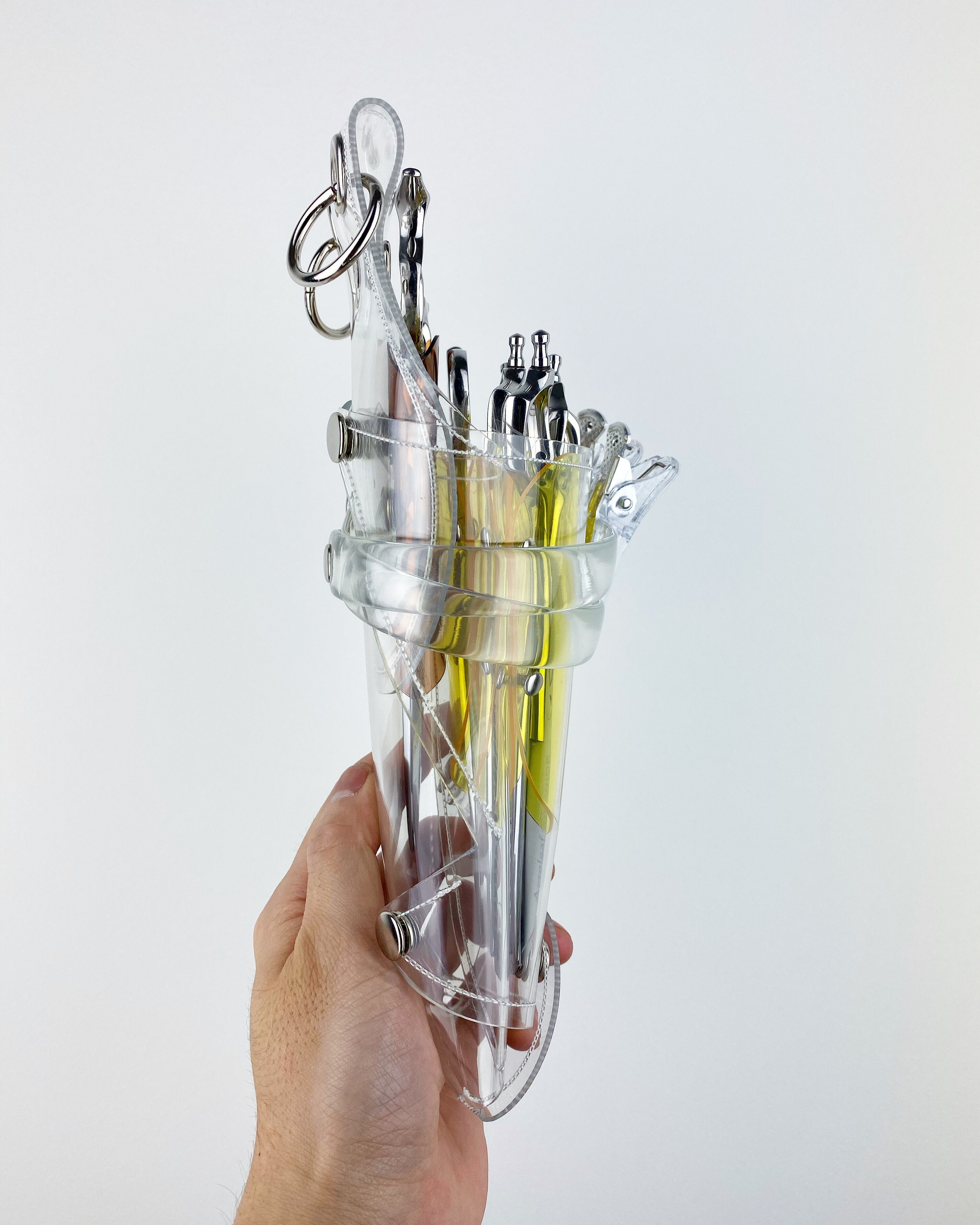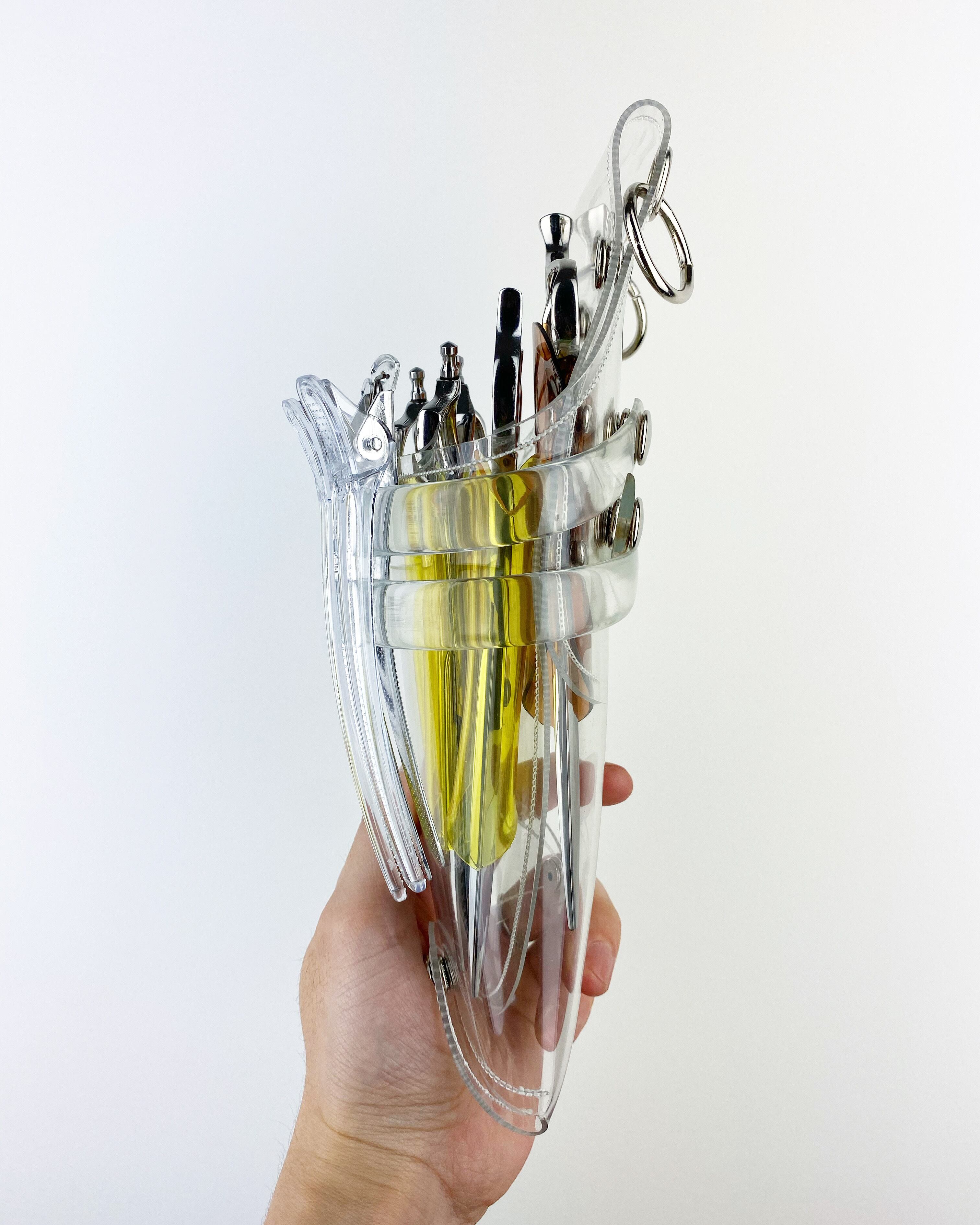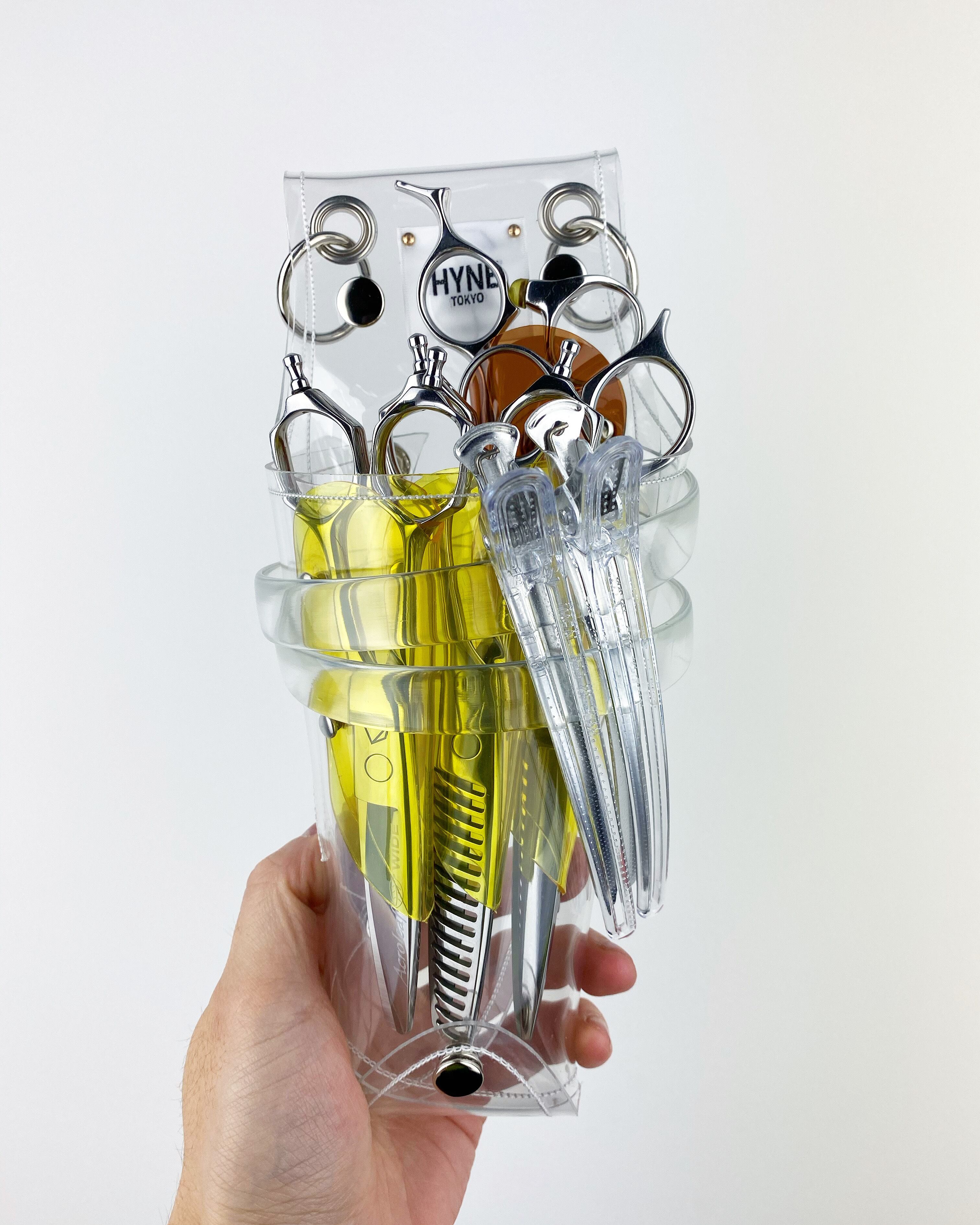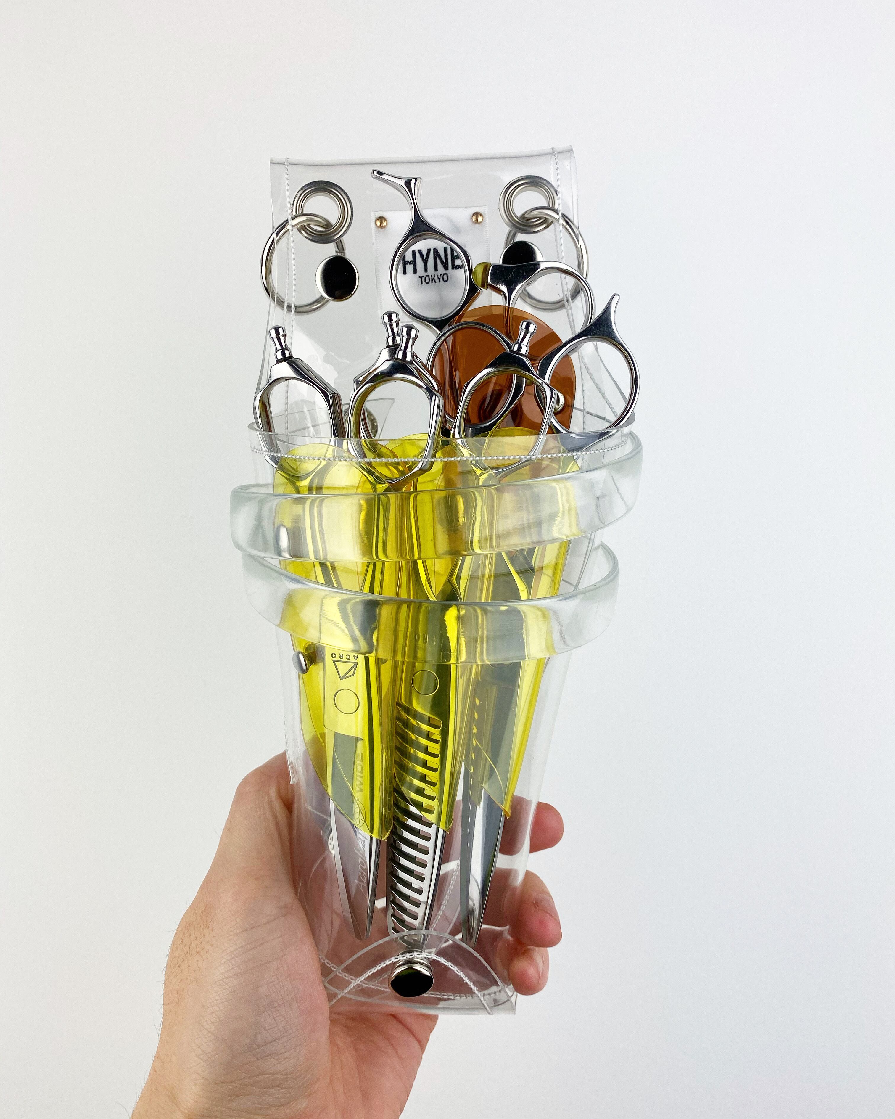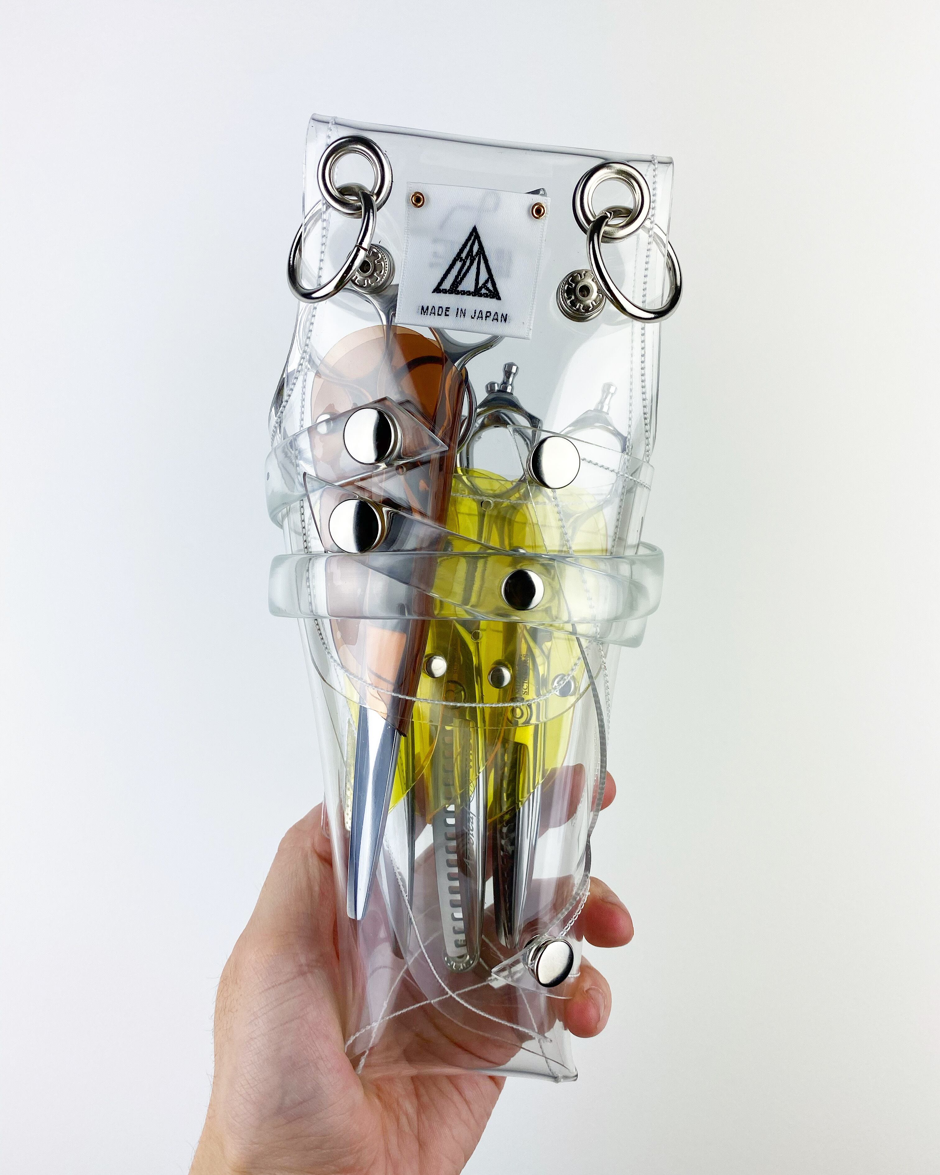 このシザーケースは、あなたのシザーを入れる事によって完成します。透明なシザーケースから仕事道具であるシザーが魅える事が最大のデザインの魅力となっています。