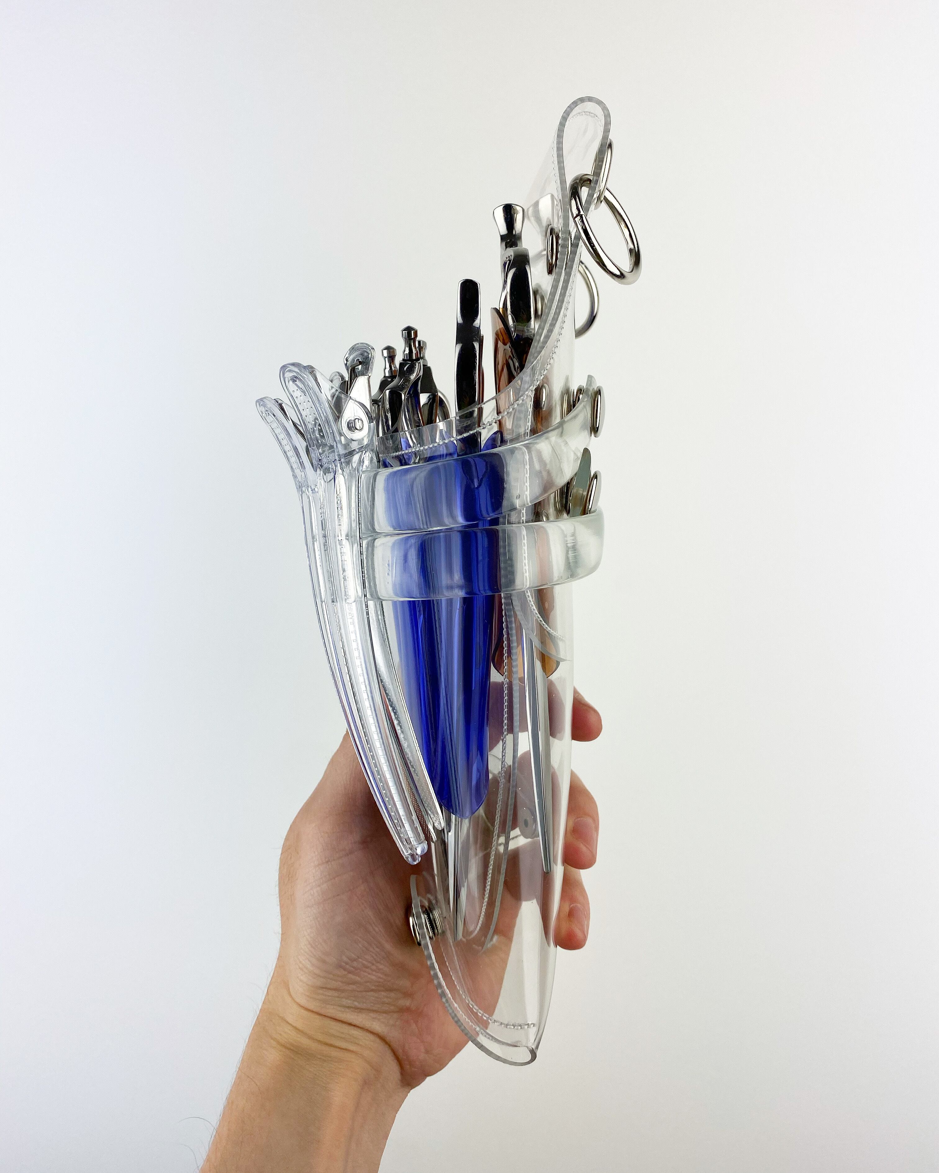PVCの特性であるクリア(透明)である事で、美容師の仕事道具であるシザーのこれまでなかった魅せ方を提案しています。