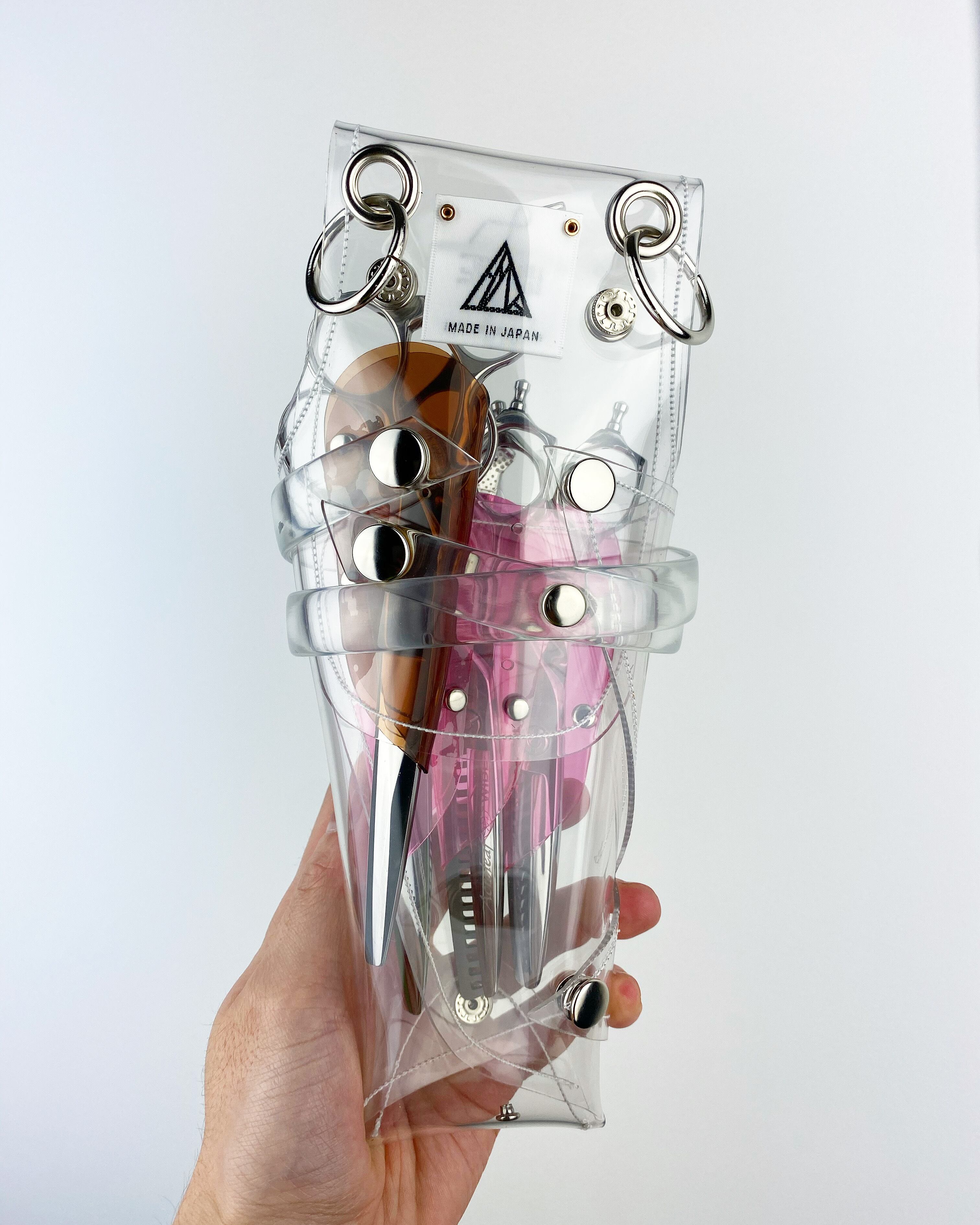 このシザーケースは、あなたのシザーを入れる事によって完成します。透明なシザーケースから仕事道具であるシザーが魅える事が最大のデザインの魅力となっています。