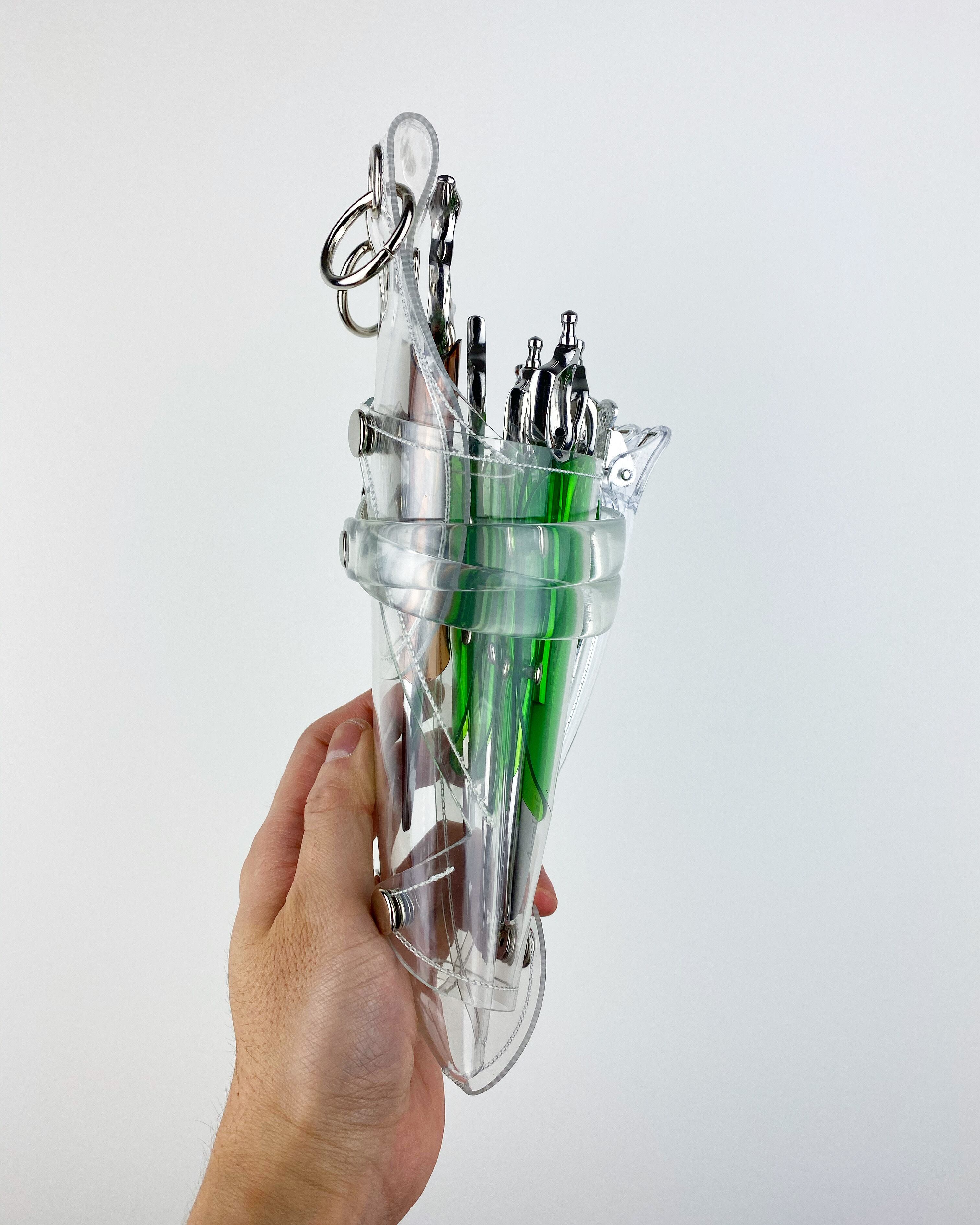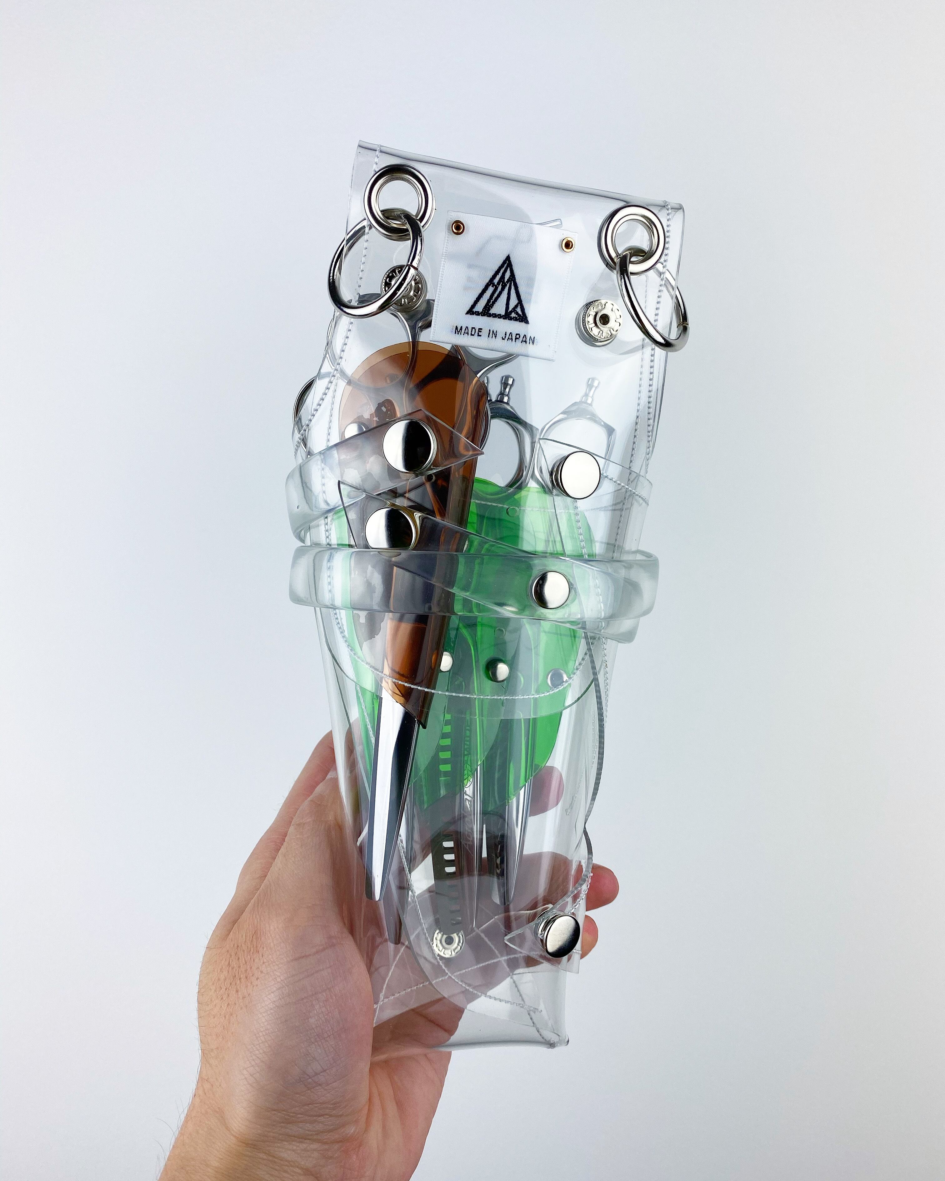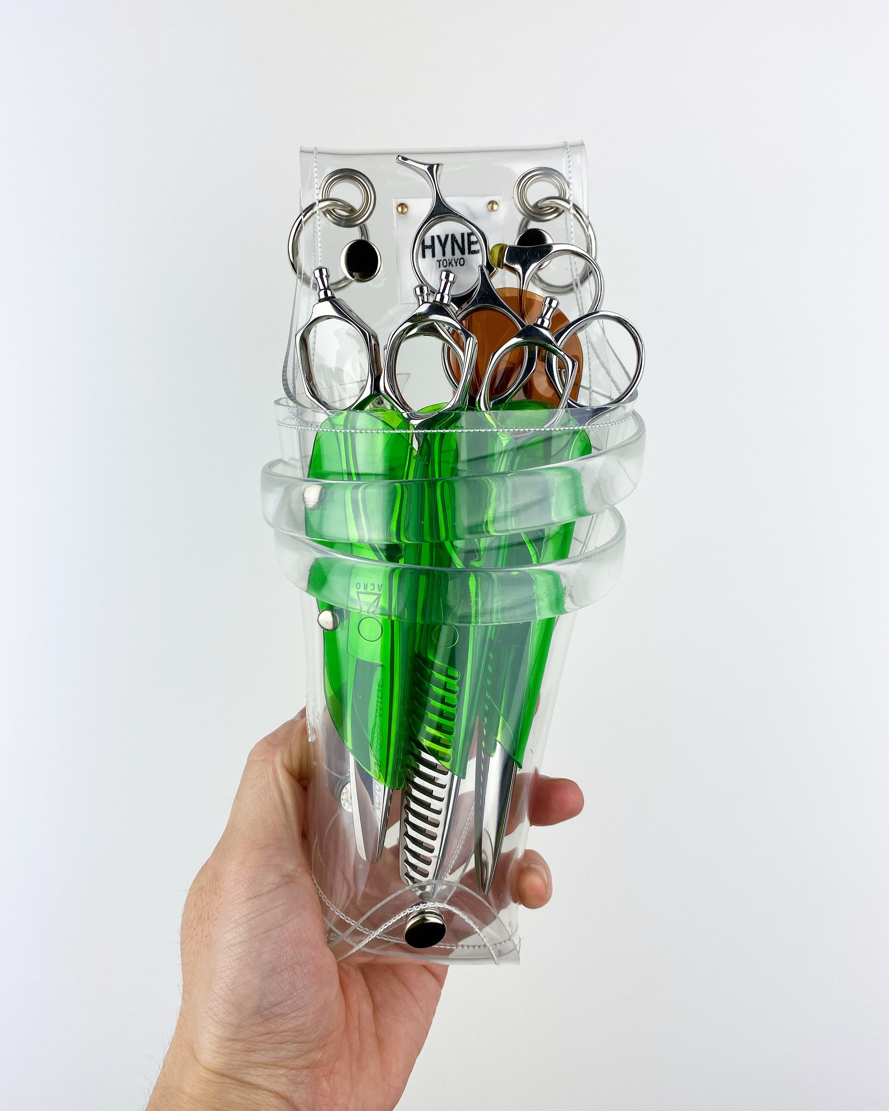 このシザーケースは、あなたのシザーを入れる事によって完成します。透明なシザーケースから仕事道具であるシザーが魅える事が最大のデザインの魅力となっています。