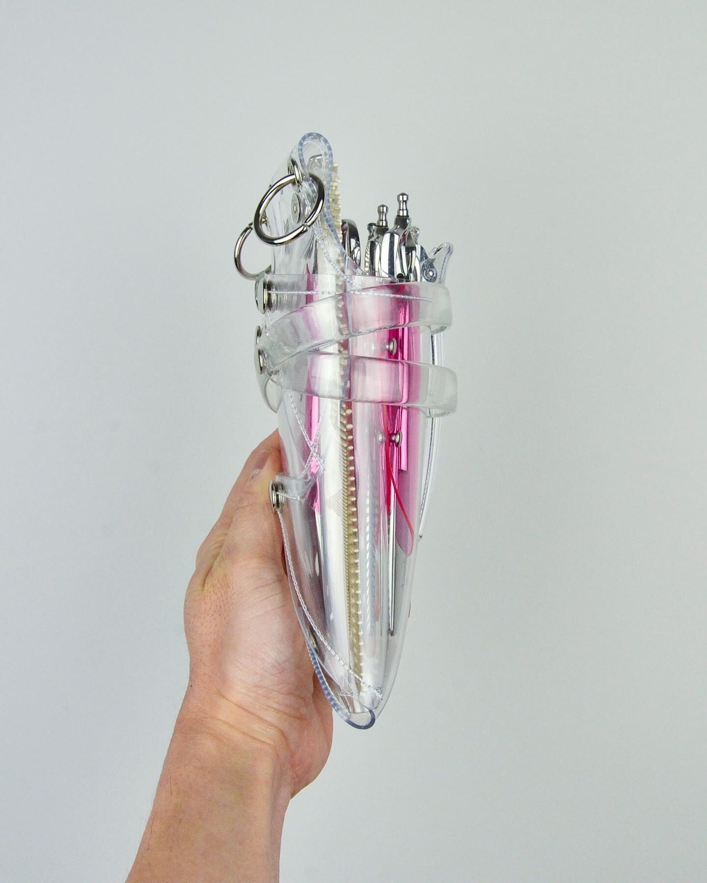 このシザーケースは、あなたのシザーを入れる事によって完成します。透明なシザーケースから仕事道具であるシザーが魅える事が最大のデザインの魅力となっています。