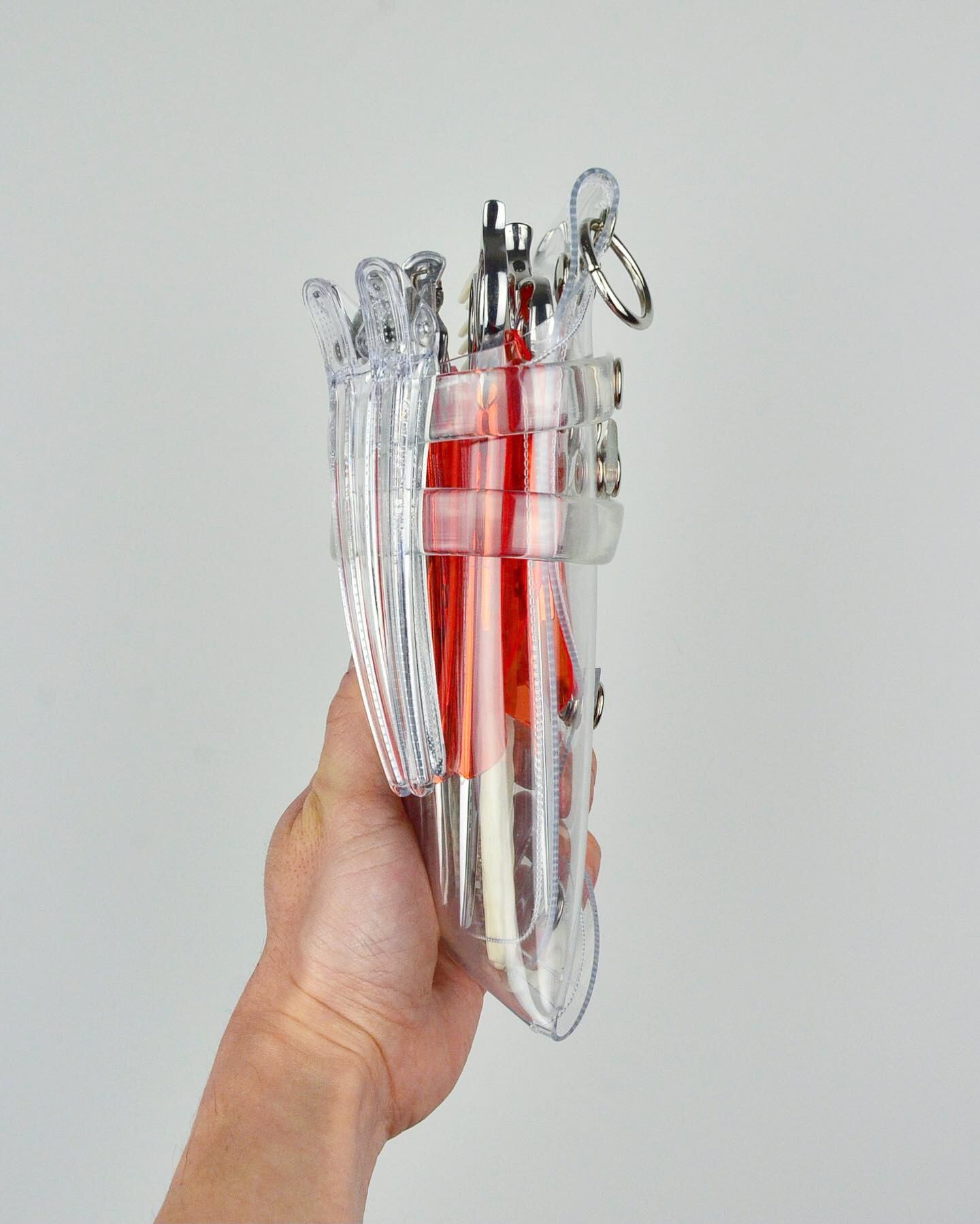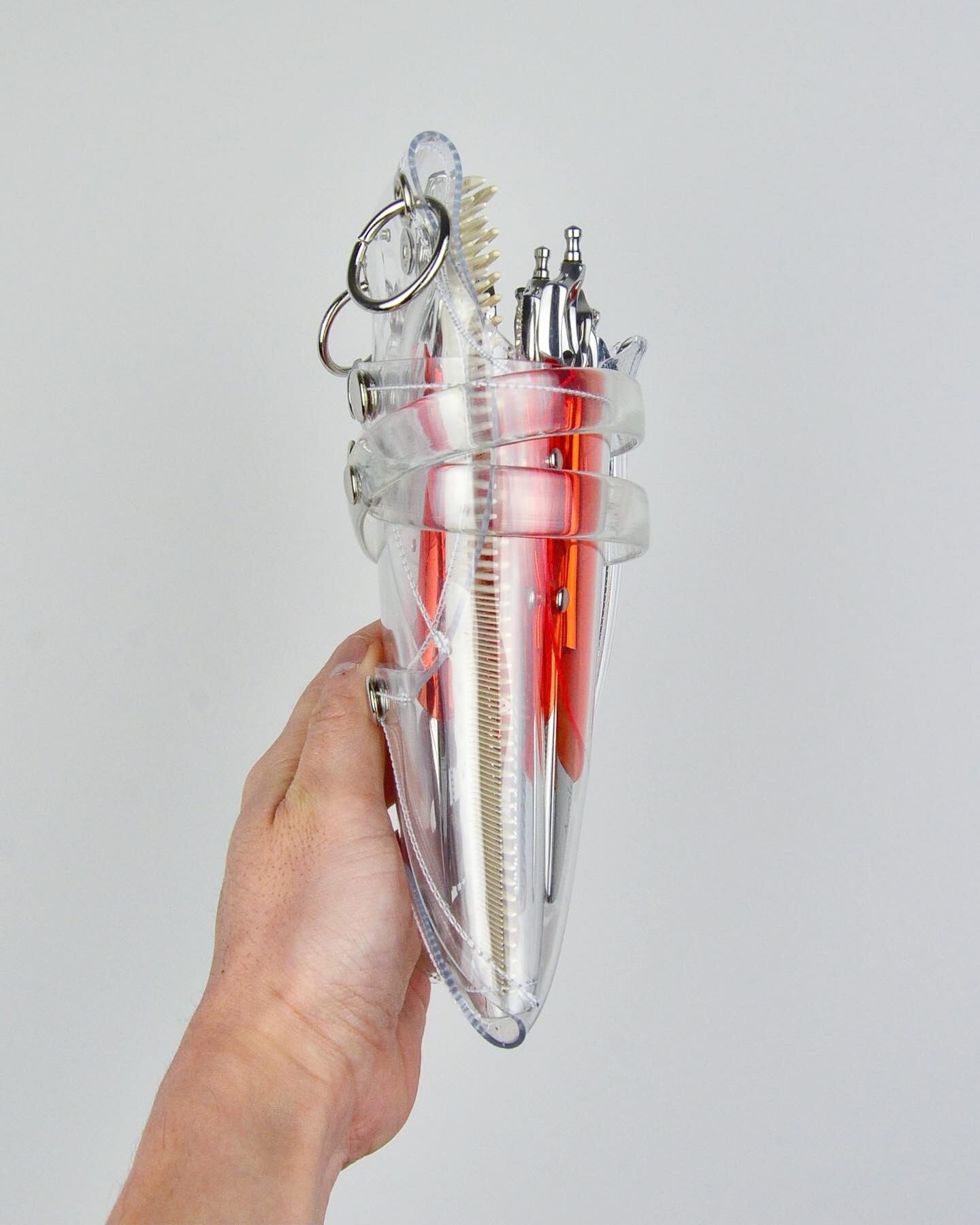 このシザーケースは、あなたのシザーを入れる事によって完成します。透明なシザーケースから仕事道具であるシザーが魅える事が最大のデザインの魅力となっています。