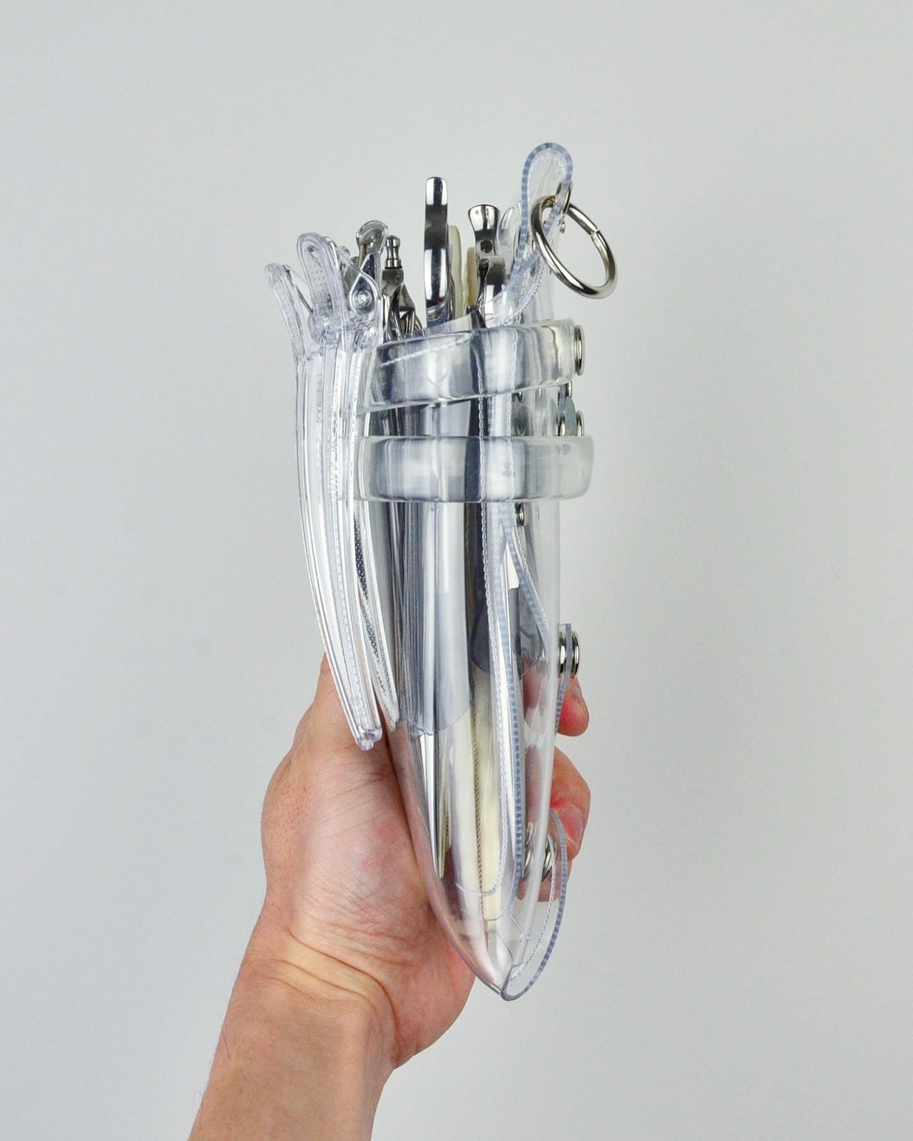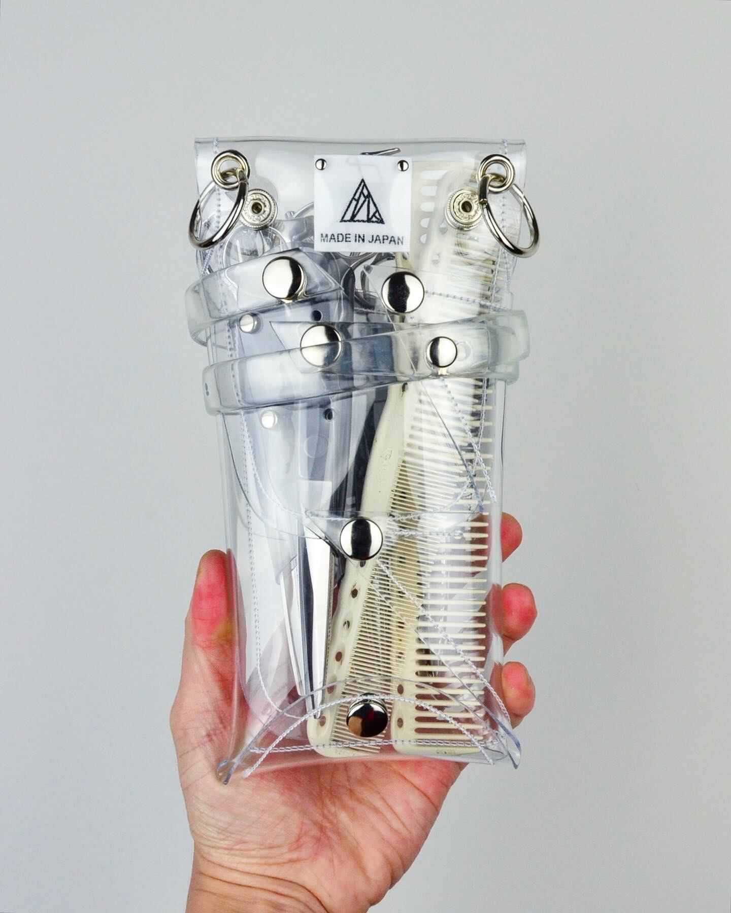 このシザーケースは、あなたのシザーを入れる事によって完成します。透明なシザーケースから仕事道具であるシザーが魅える事が最大のデザインの魅力となっています。
