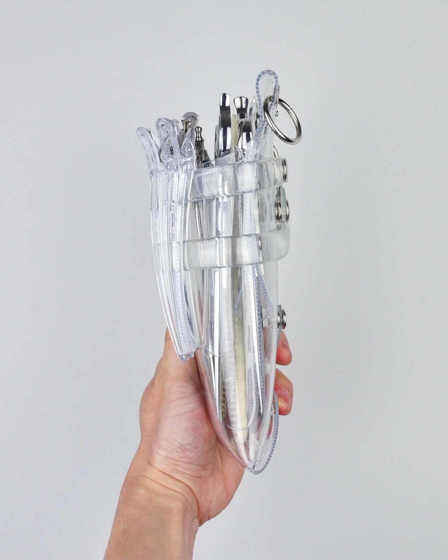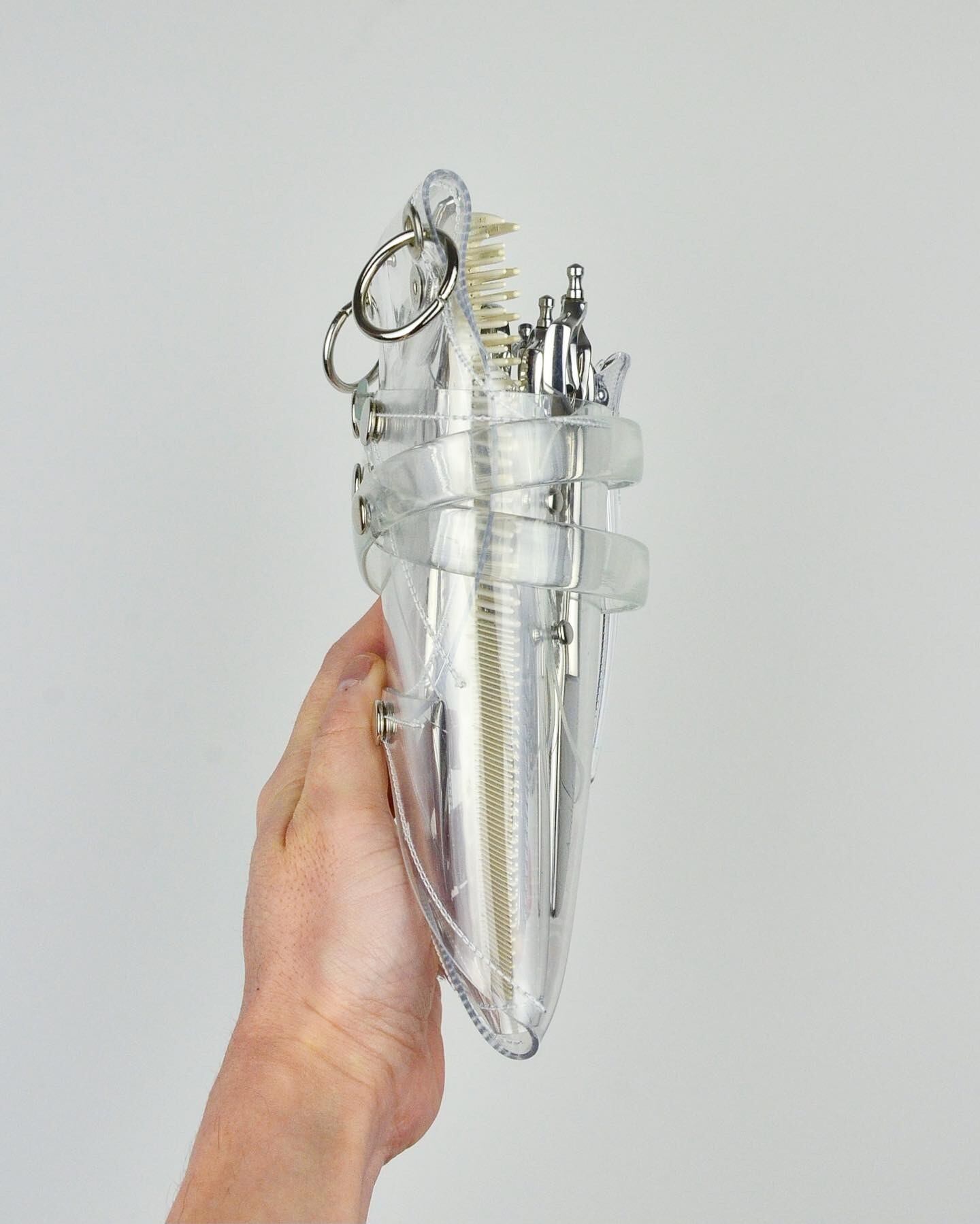 このシザーケースは、あなたのシザーを入れる事によって完成します。透明なシザーケースから仕事道具であるシザーが魅える事が最大のデザインの魅力となっています。