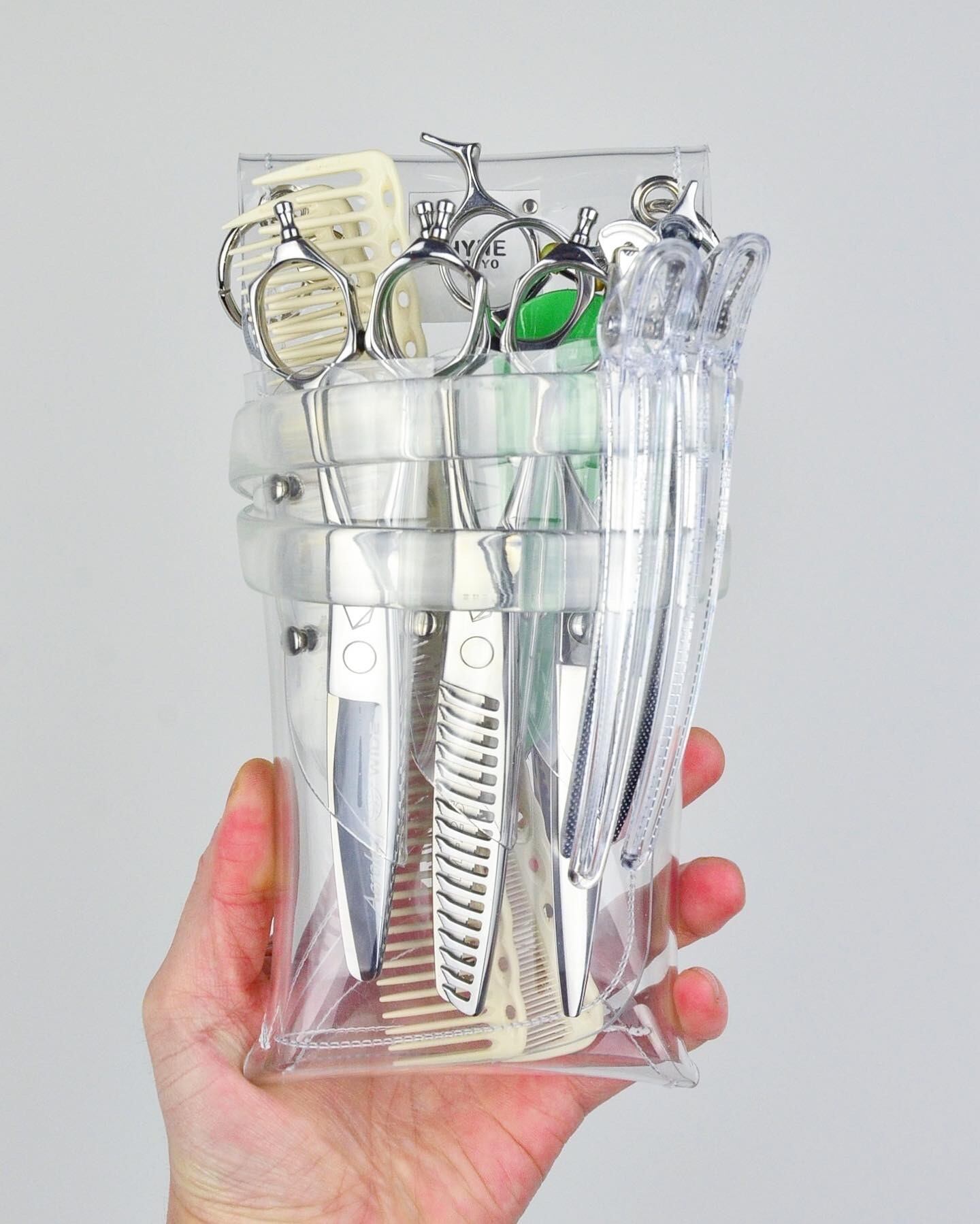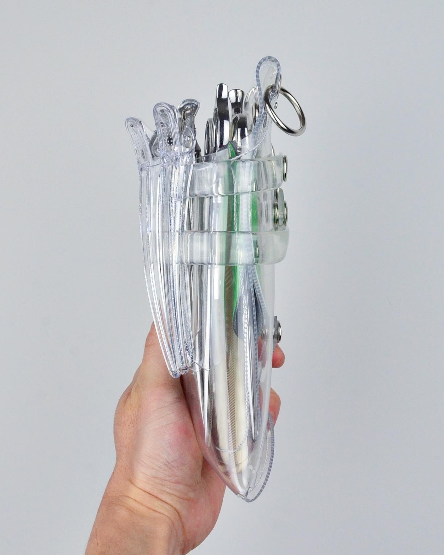 このシザーケースは、あなたのシザーを入れる事によって完成します。透明なシザーケースから仕事道具であるシザーが魅える事が最大のデザインの魅力となっています。