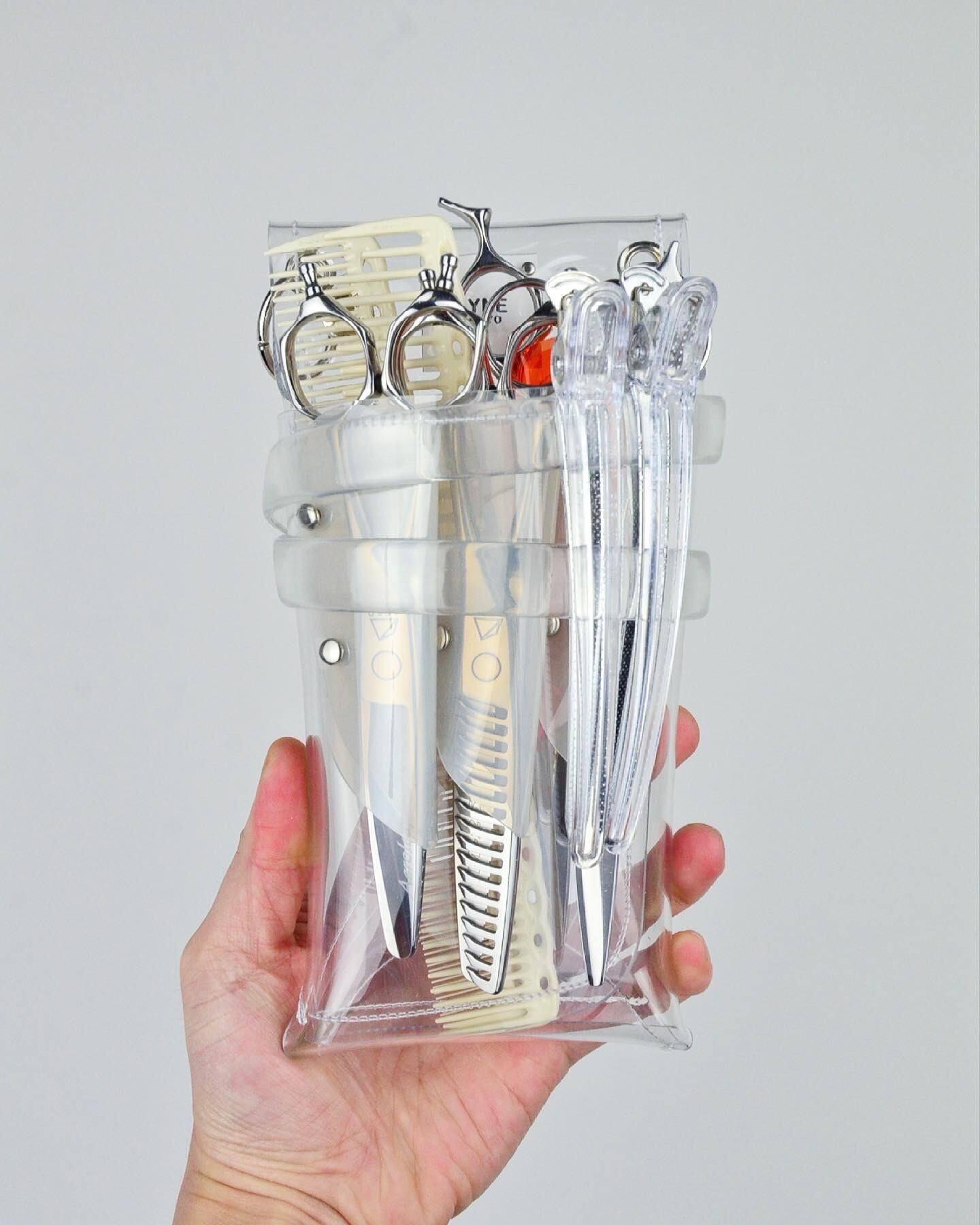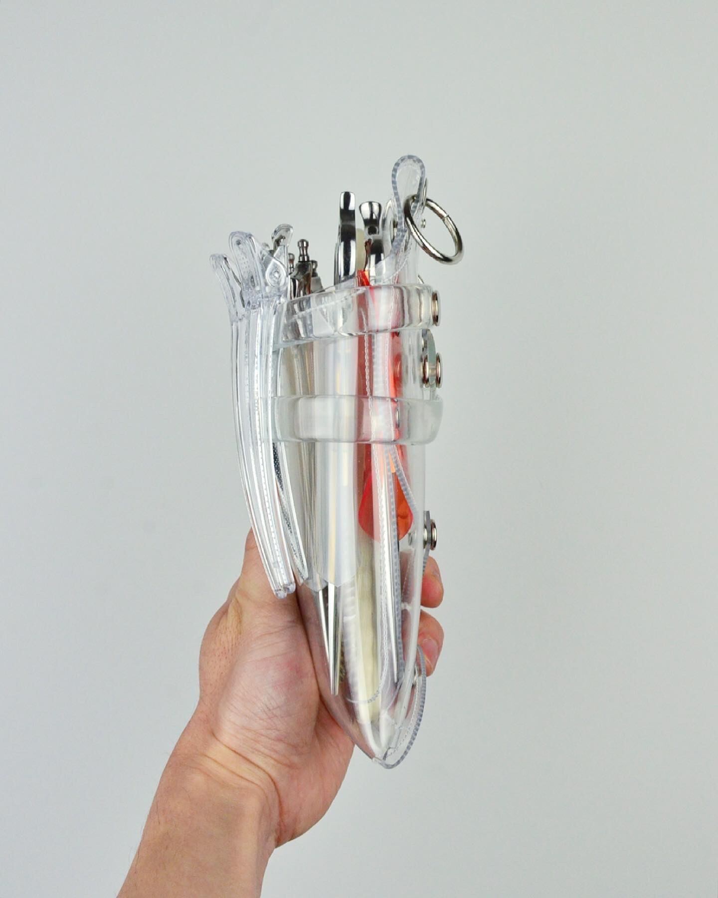 このシザーケースは、あなたのシザーを入れる事によって完成します。透明なシザーケースから仕事道具であるシザーが魅える事が最大のデザインの魅力となっています。