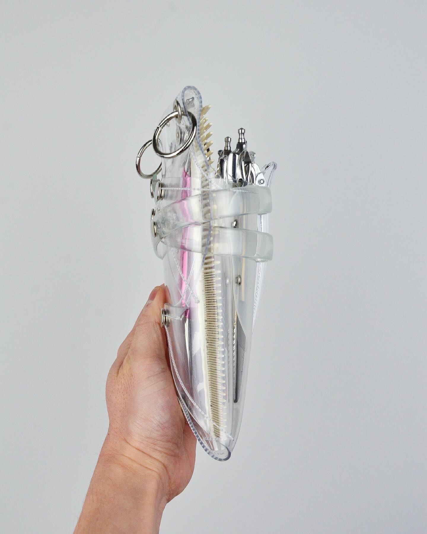 このシザーケースは、あなたのシザーを入れる事によって完成します。透明なシザーケースから仕事道具であるシザーが魅える事が最大のデザインの魅力となっています。