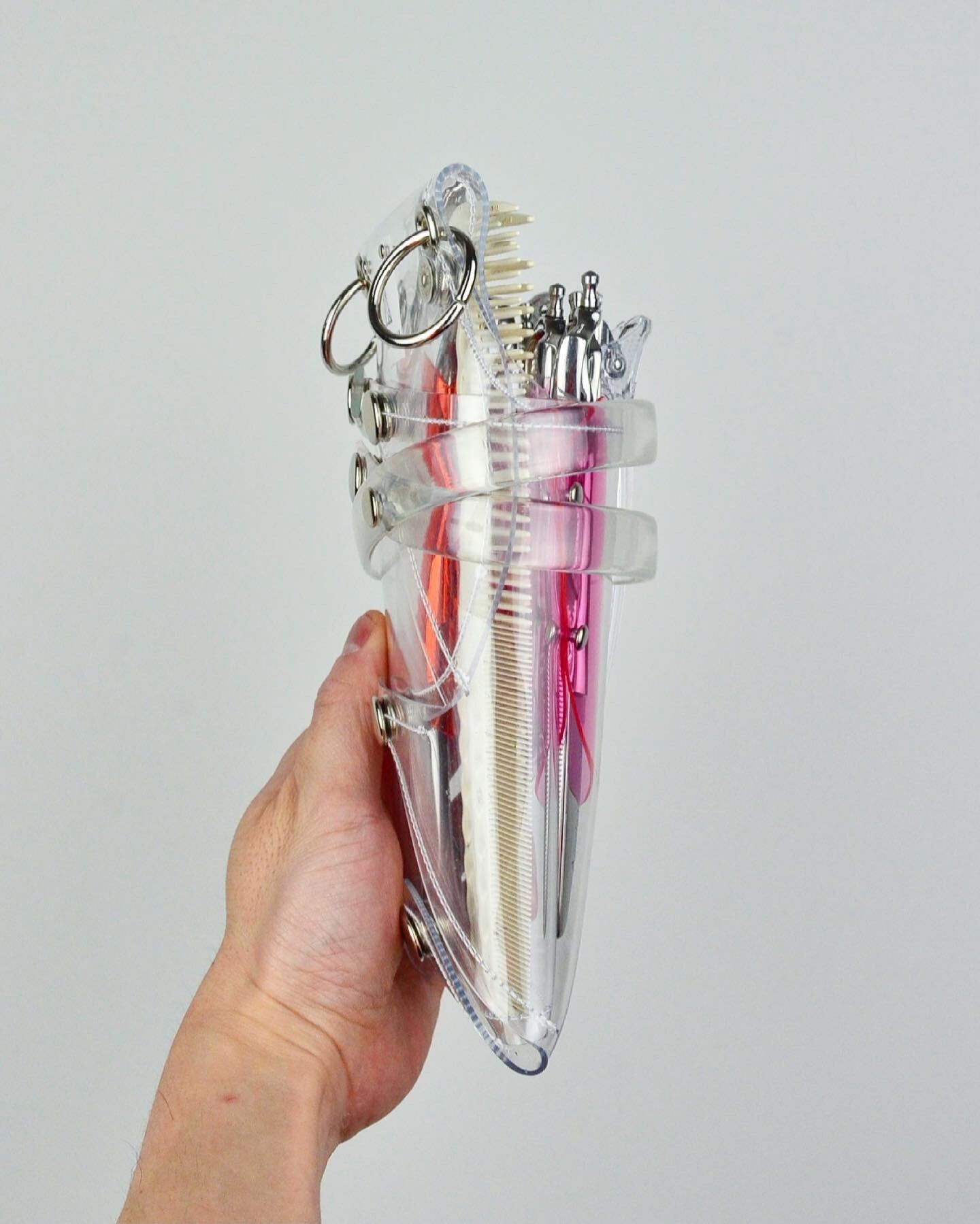 このシザーケースは、あなたのシザーを入れる事によって完成します。透明なシザーケースから仕事道具であるシザーが魅える事が最大のデザインの魅力となっています。