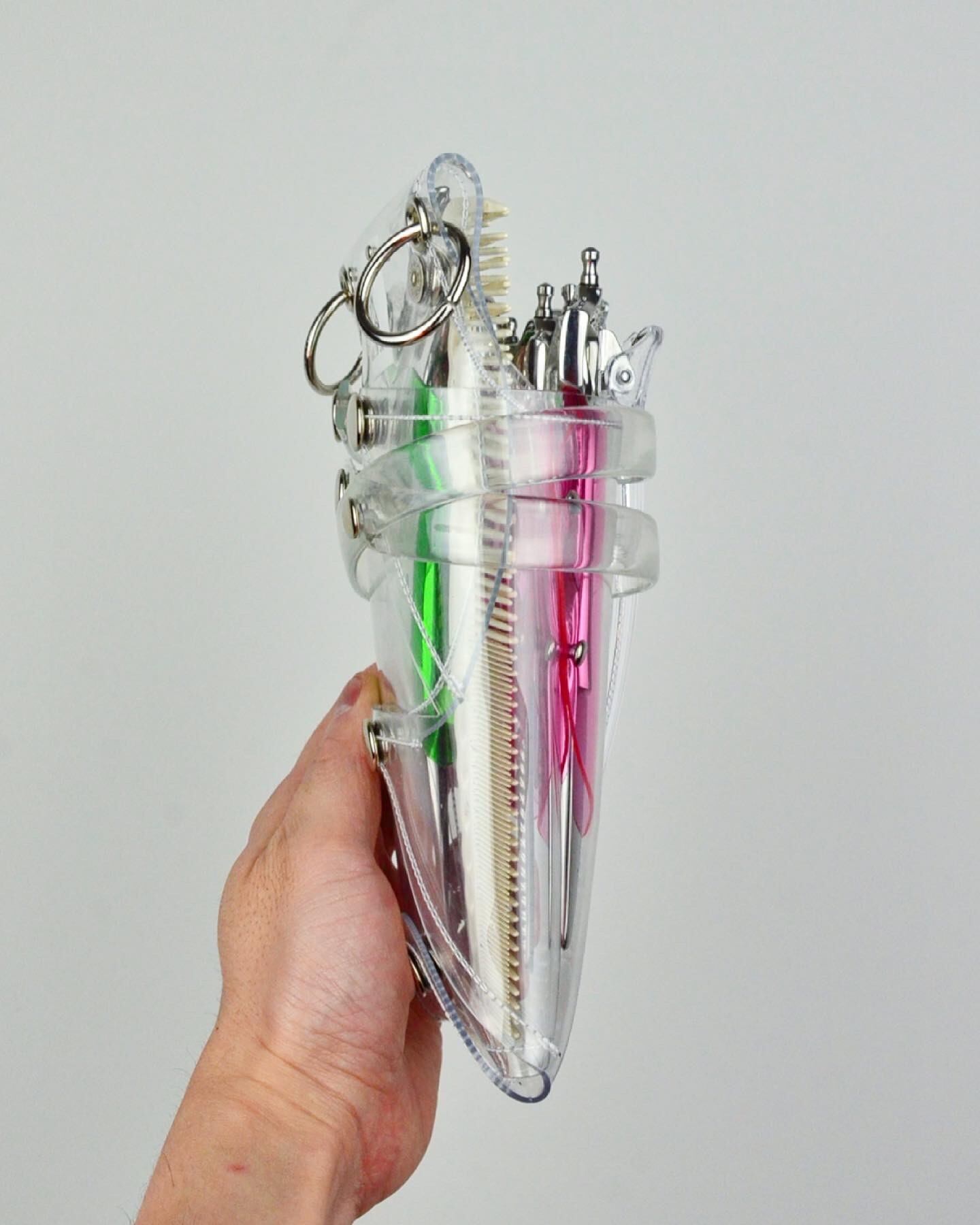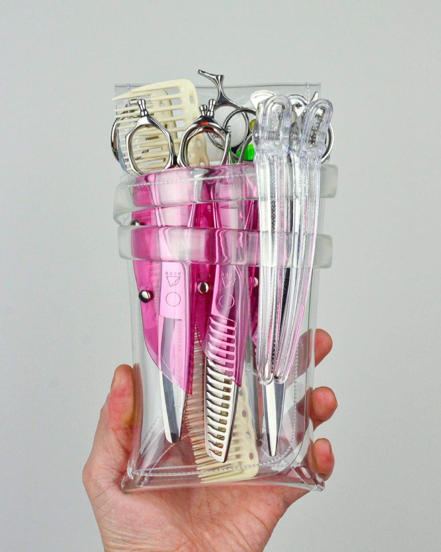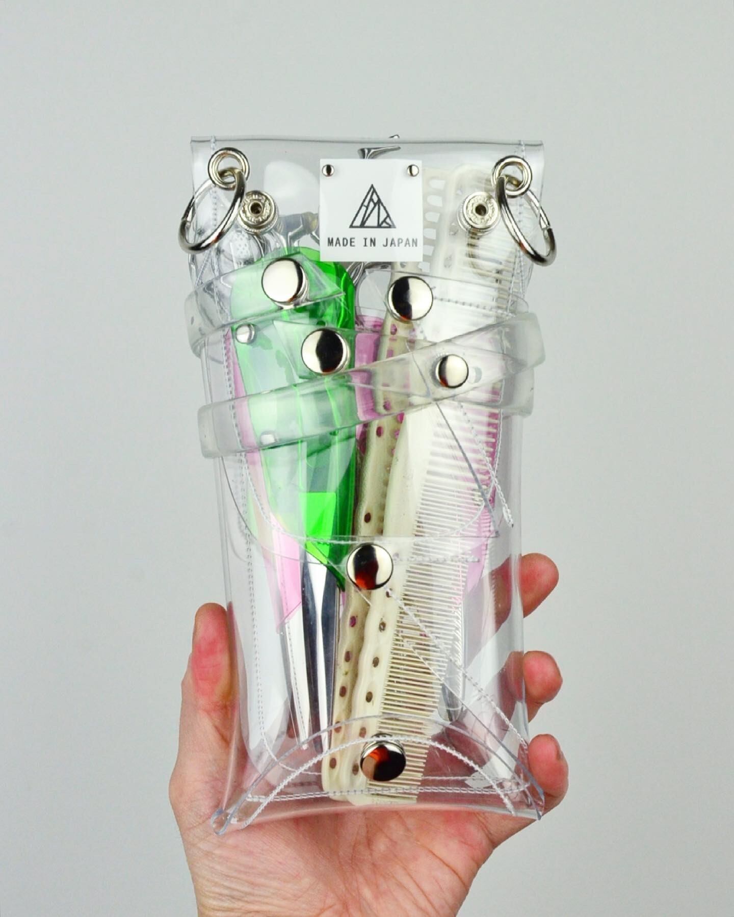 このシザーケースは、あなたのシザーを入れる事によって完成します。透明なシザーケースから仕事道具であるシザーが魅える事が最大のデザインの魅力となっています。