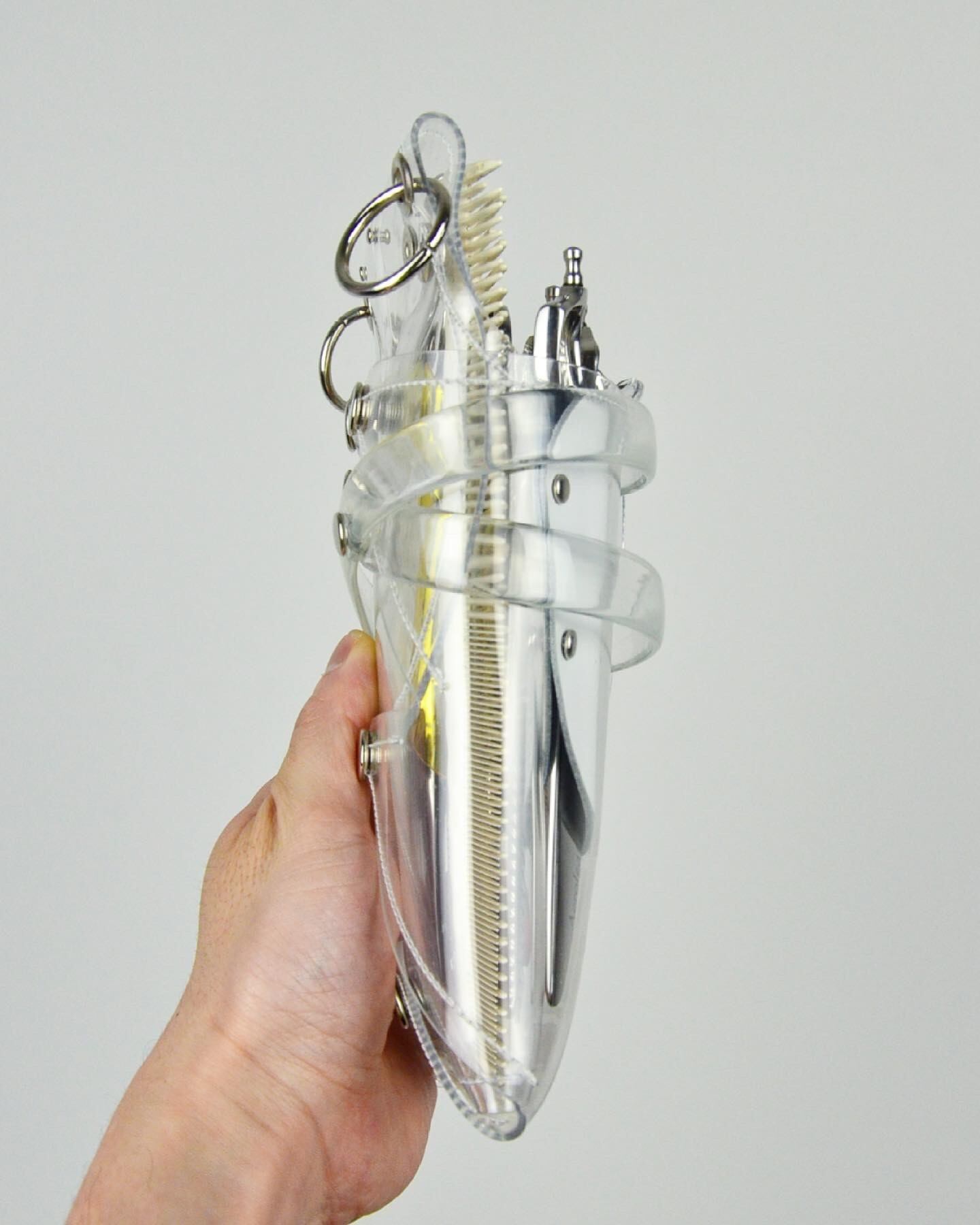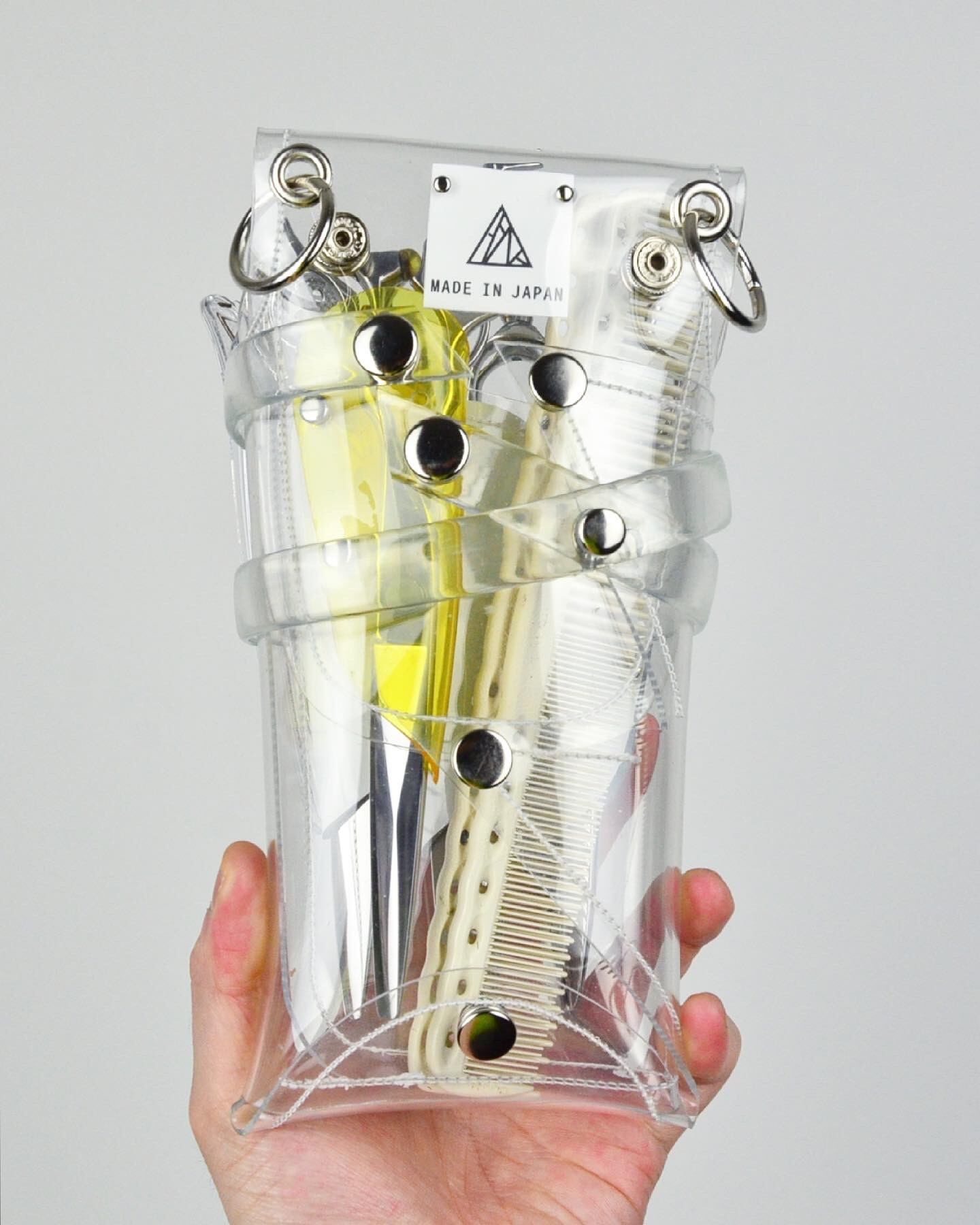 このシザーケースは、あなたのシザーを入れる事によって完成します。透明なシザーケースから仕事道具であるシザーが魅える事が最大のデザインの魅力となっています。