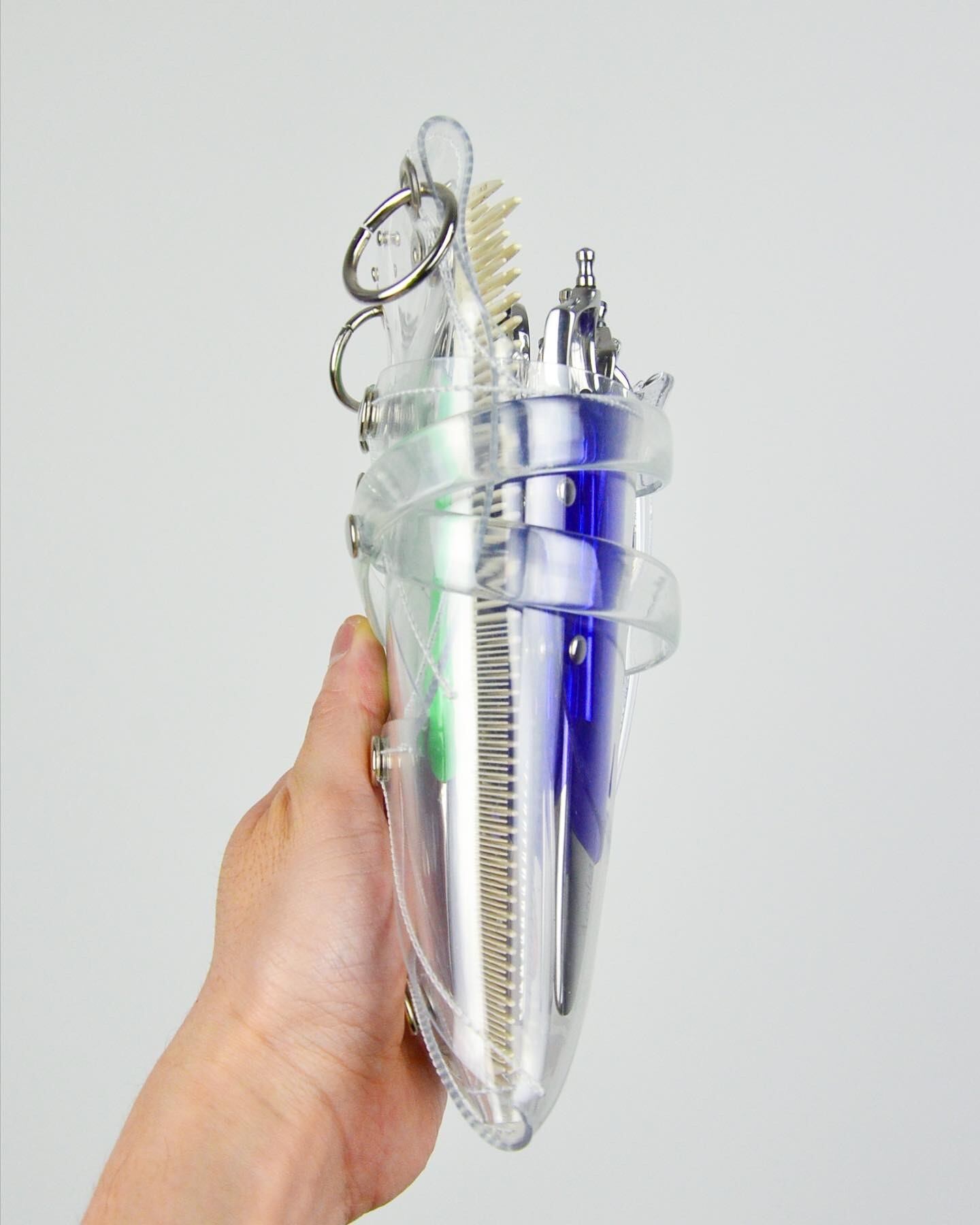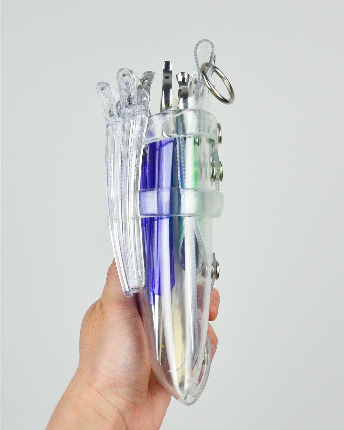 このシザーケースは、あなたのシザーを入れる事によって完成します。透明なシザーケースから仕事道具であるシザーが魅える事が最大のデザインの魅力となっています。