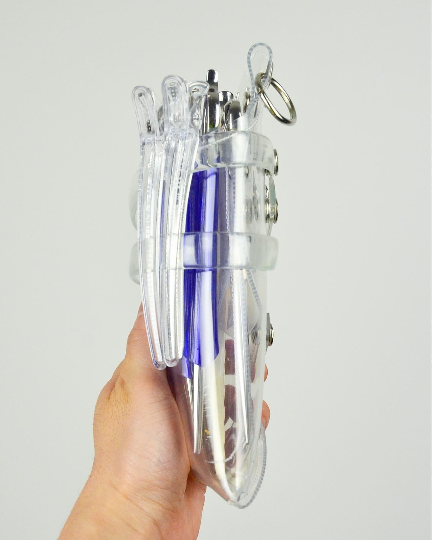 PVCの特性であるクリア(透明)である事で、美容師の仕事道具であるシザーのこれまでなかった魅せ方を提案しています。