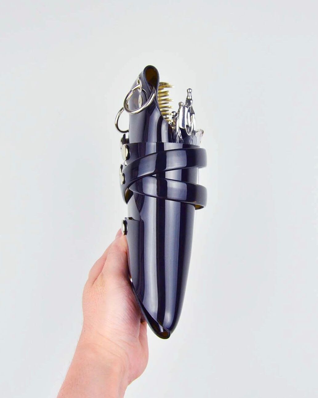 このシザーケースは、あなたのシザーを入れる事によって完成します。透明なシザーケースから仕事道具であるシザーが魅える事が最大のデザインの魅力となっています。