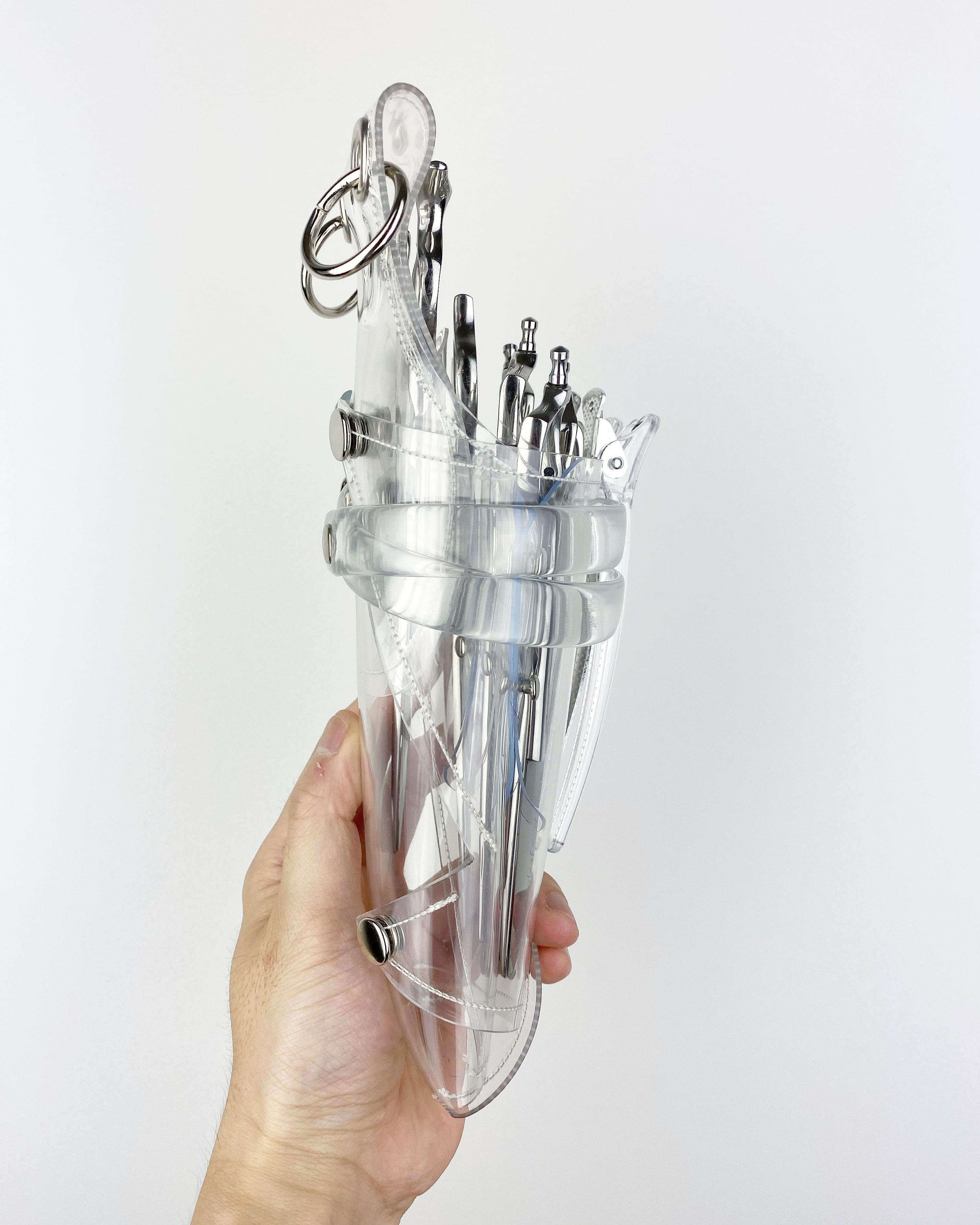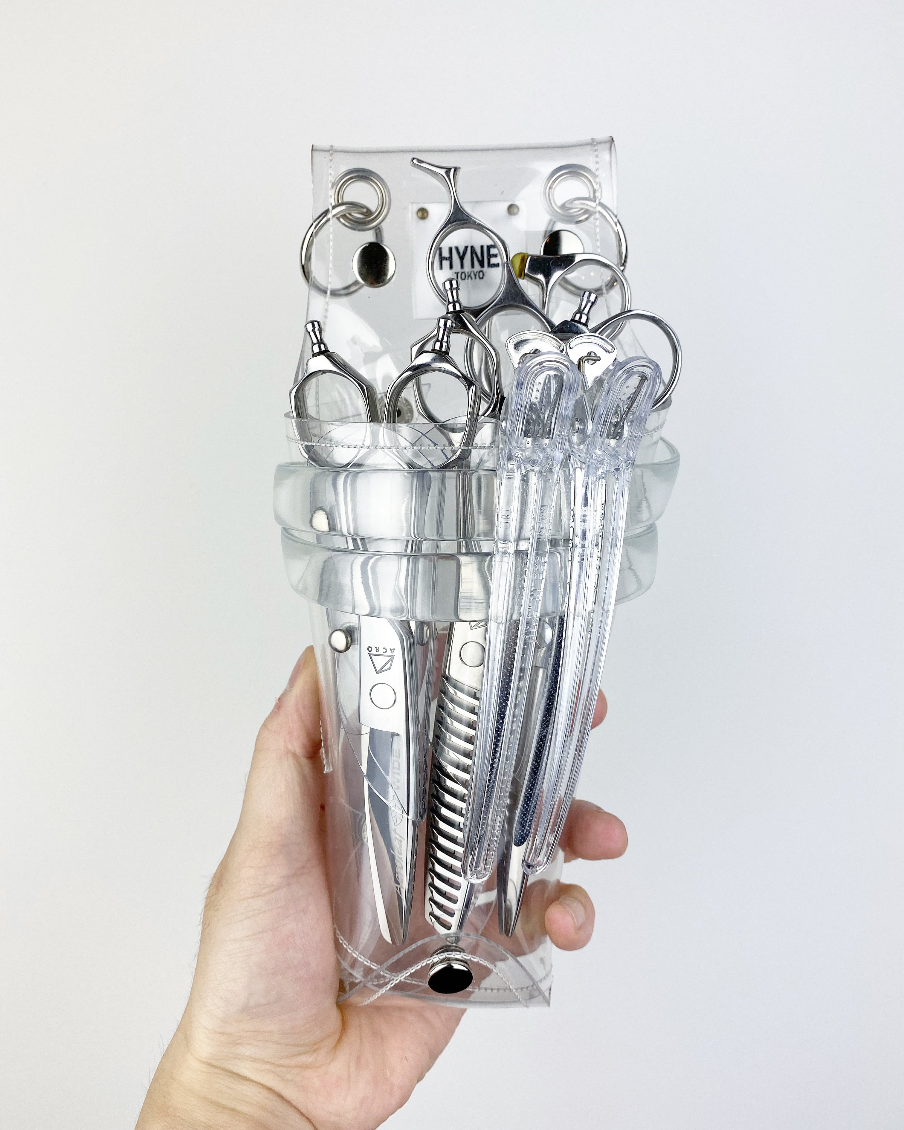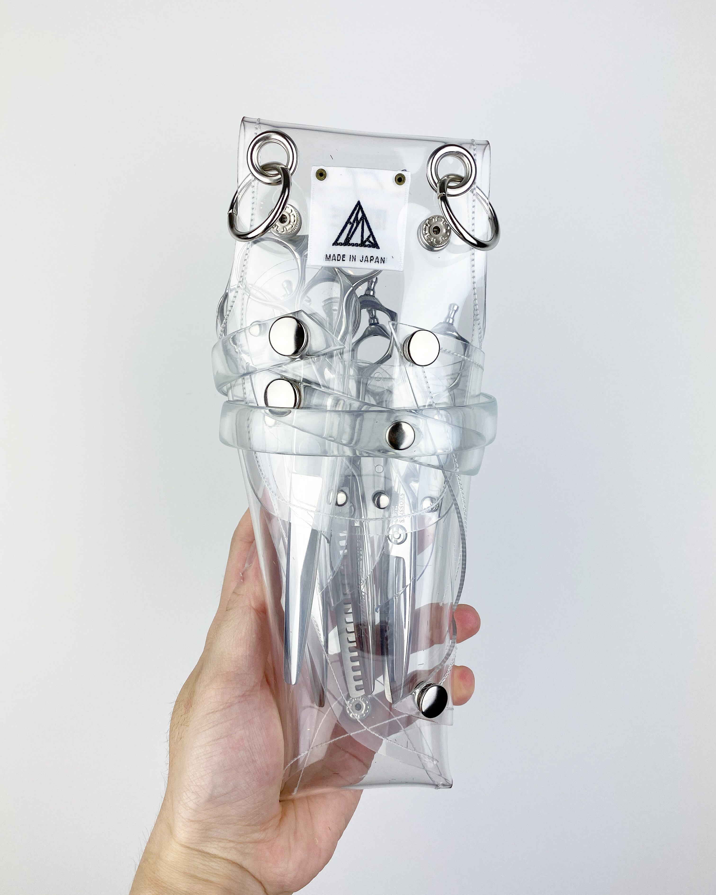 このシザーケースは、あなたのシザーを入れる事によって完成します。透明なシザーケースから仕事道具であるシザーが魅える事が最大のデザインの魅力となっています。