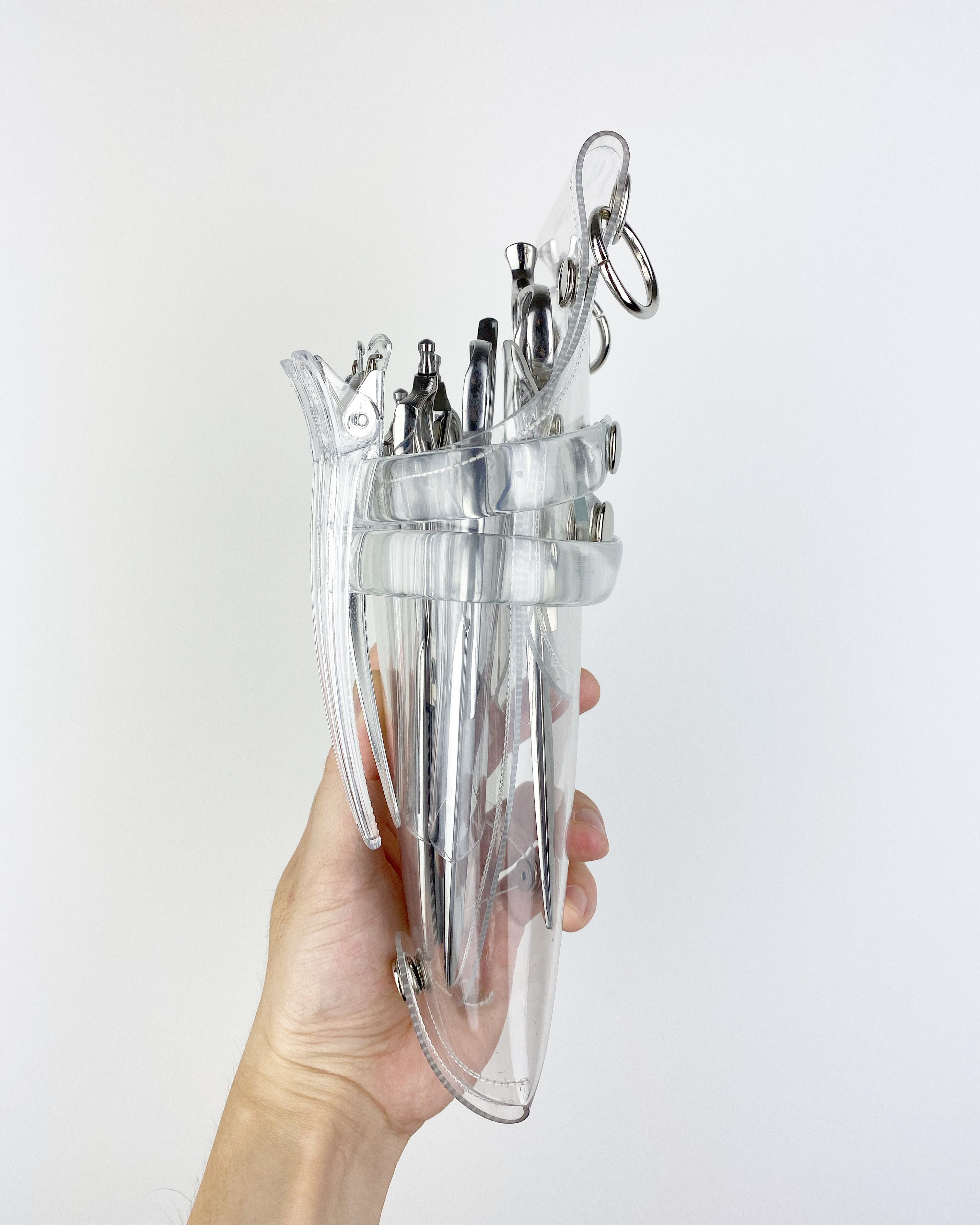 PVCの特性であるクリア(透明)である事で、美容師の仕事道具であるシザーのこれまでなかった魅せ方を提案しています。