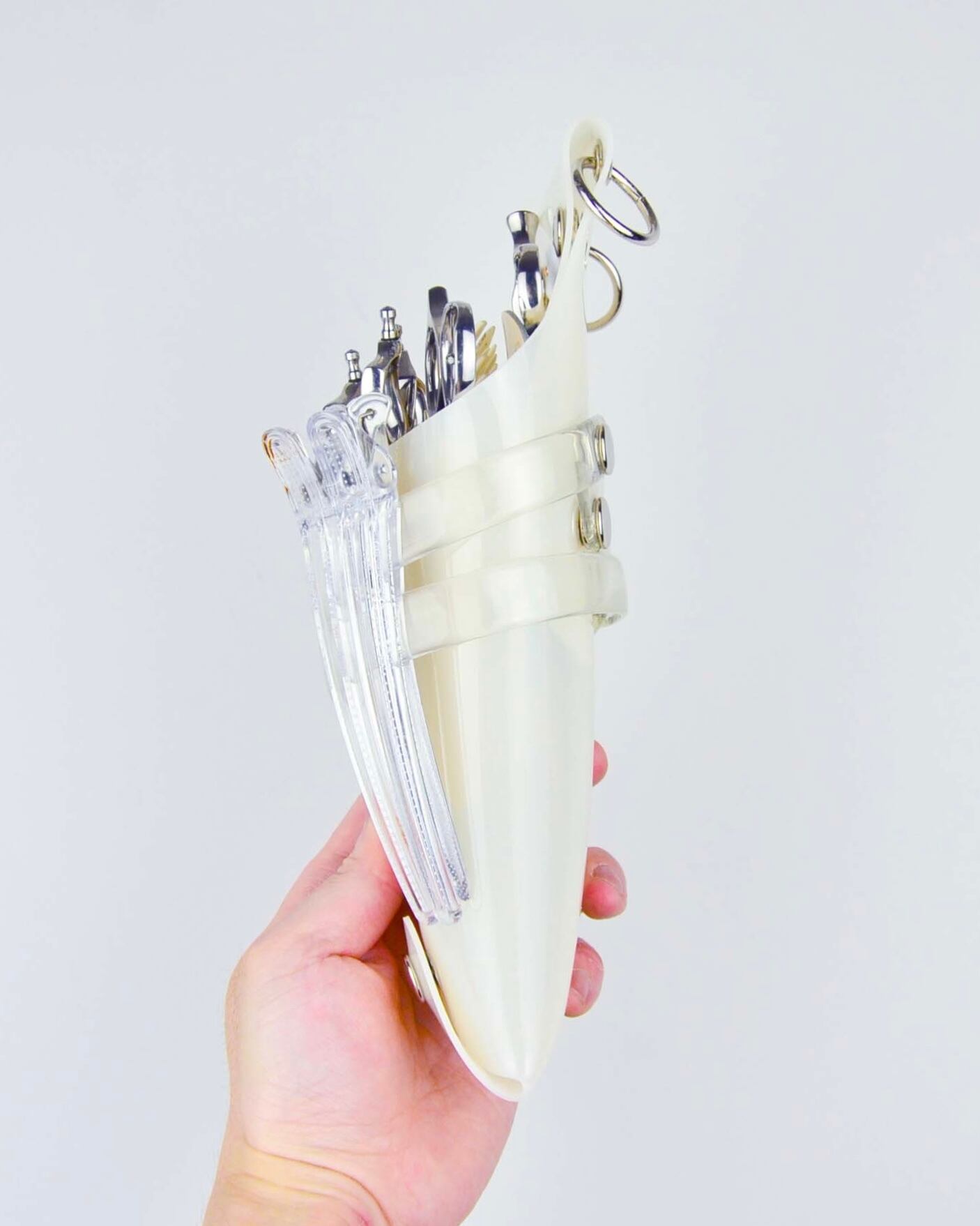 このシザーケースは、あなたのシザーを入れる事によって完成します。透明なシザーケースから仕事道具であるシザーが魅える事が最大のデザインの魅力となっています。