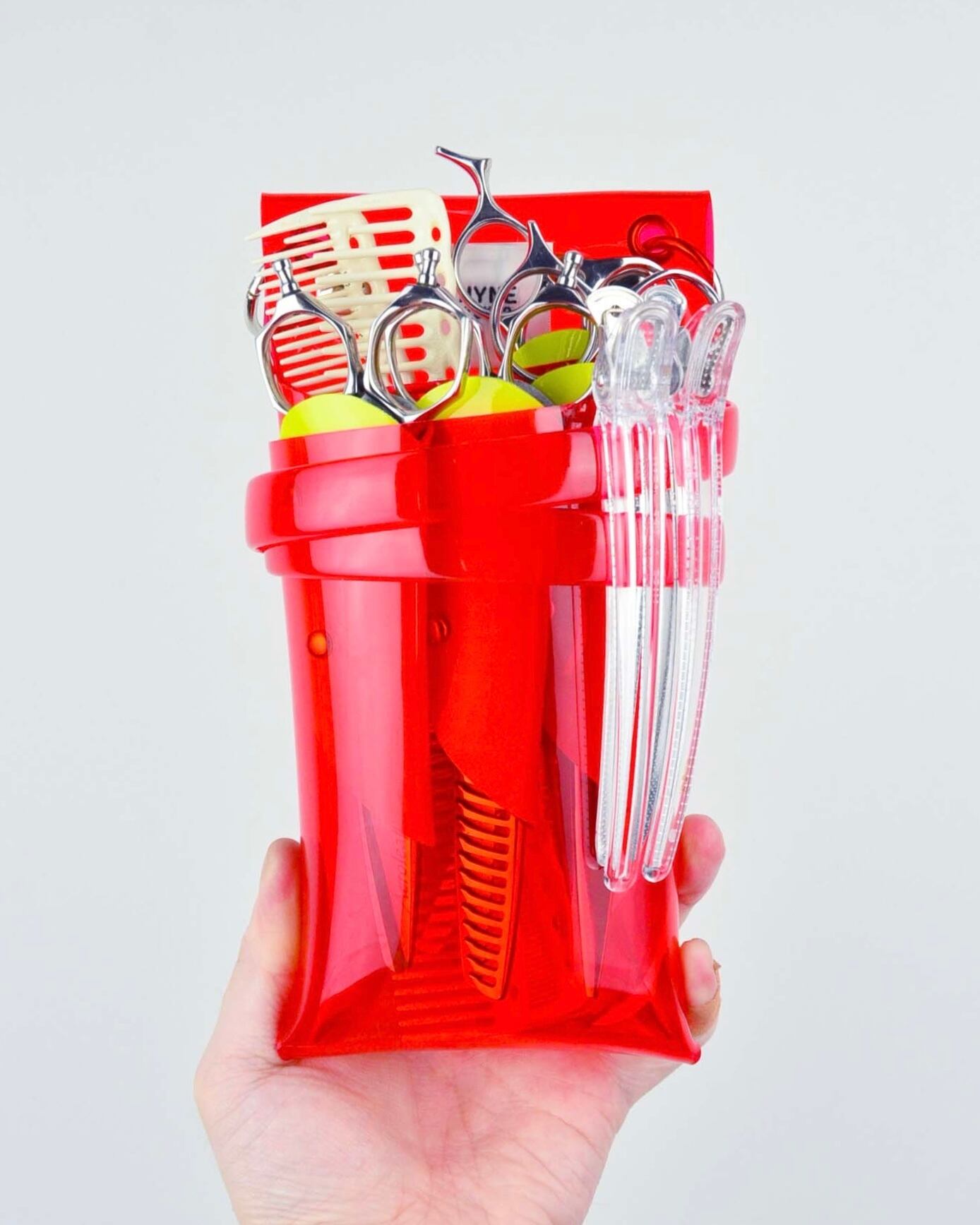 PVCの特性であるクリア(透明)である事で、美容師の仕事道具であるシザーのこれまでなかった魅せ方を提案しています。