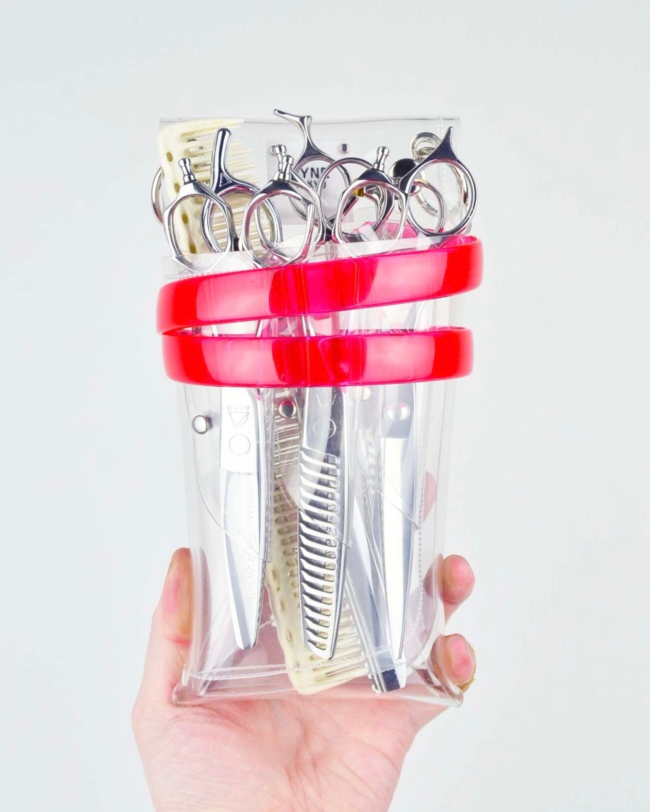 このシザーケースは、あなたのシザーを入れる事によって完成します。透明なシザーケースから仕事道具であるシザーが魅える事が最大のデザインの魅力となっています。