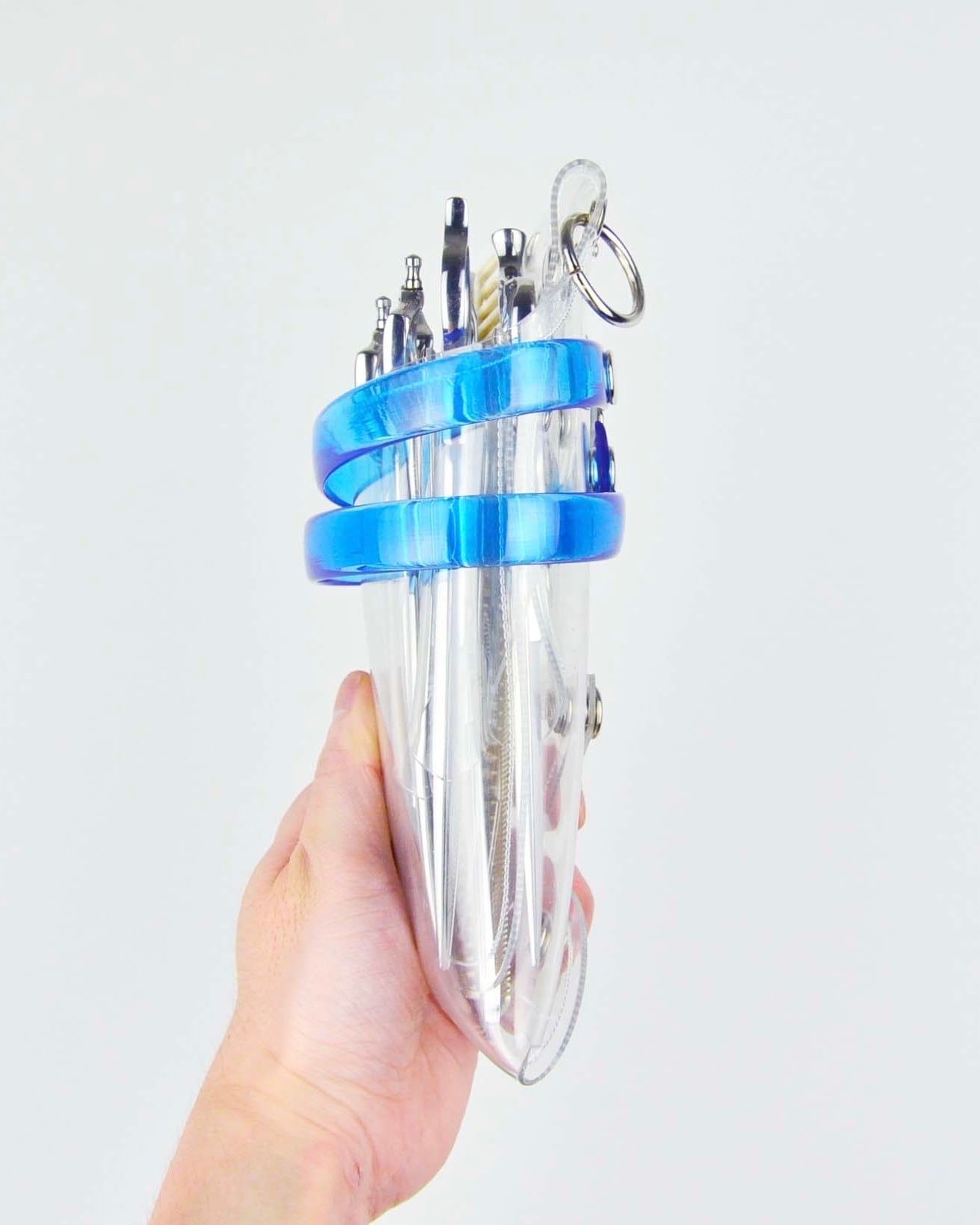 このシザーケースは、あなたのシザーを入れる事によって完成します。透明なシザーケースから仕事道具であるシザーが魅える事が最大のデザインの魅力となっています。