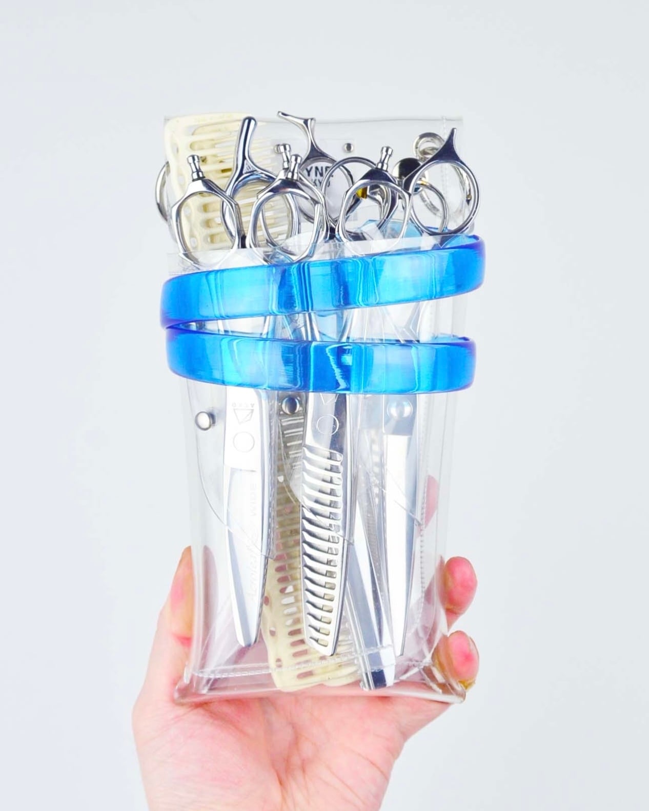 PVCの特性であるクリア(透明)である事で、美容師の仕事道具であるシザーのこれまでなかった魅せ方を提案しています。