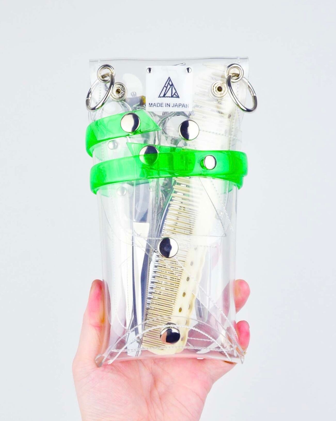 このシザーケースは、あなたのシザーを入れる事によって完成します。透明なシザーケースから仕事道具であるシザーが魅える事が最大のデザインの魅力となっています。