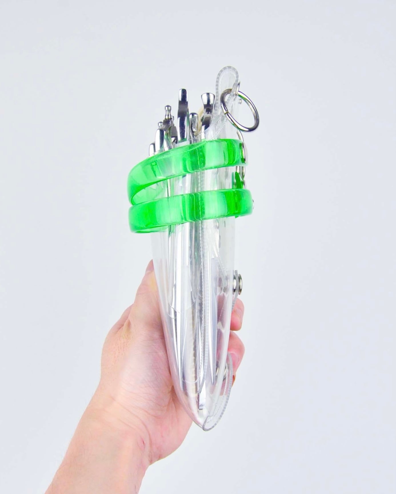 PVCの特性であるクリア(透明)である事で、美容師の仕事道具であるシザーのこれまでなかった魅せ方を提案しています。