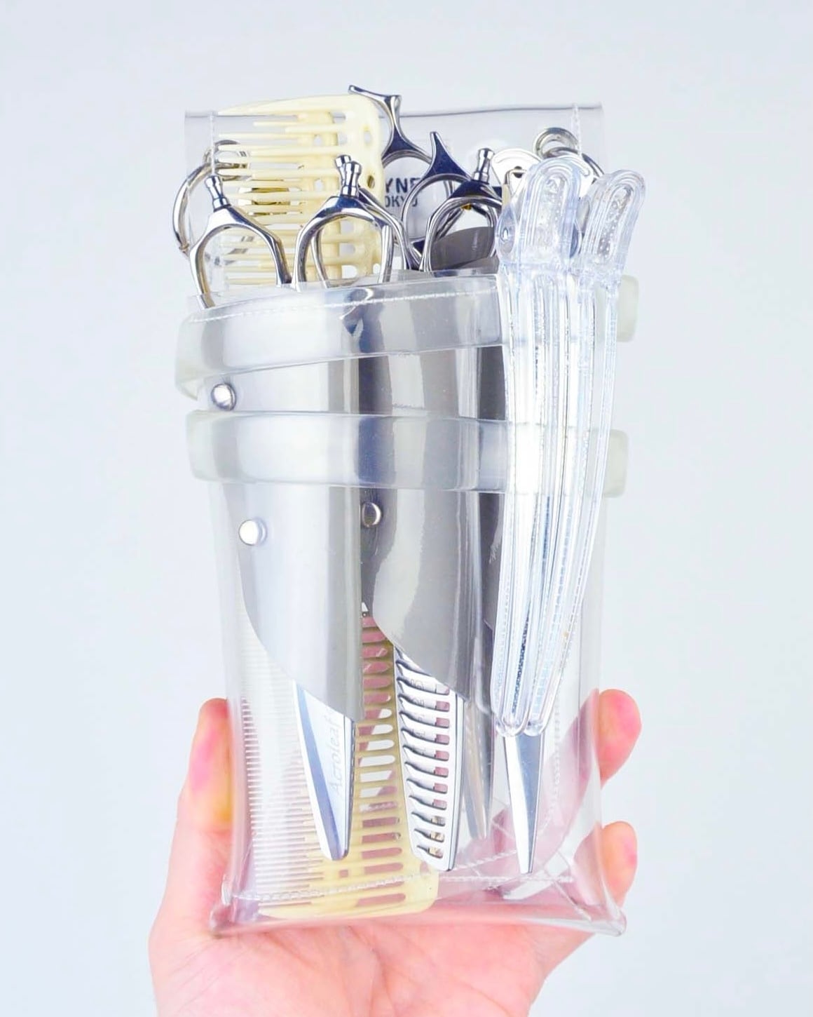 PVCの特性であるクリア(透明)である事で、美容師の仕事道具であるシザーのこれまでなかった魅せ方を提案しています。