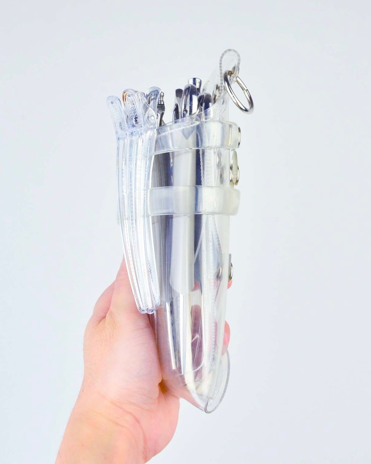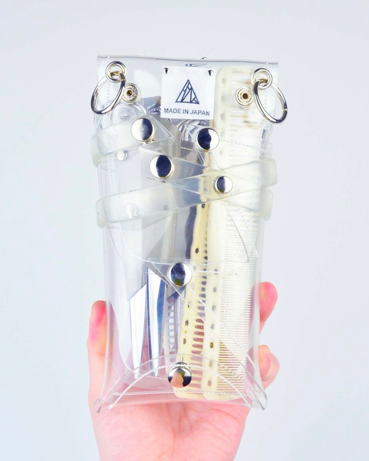 このシザーケースは、あなたのシザーを入れる事によって完成します。透明なシザーケースから仕事道具であるシザーが魅える事が最大のデザインの魅力となっています。